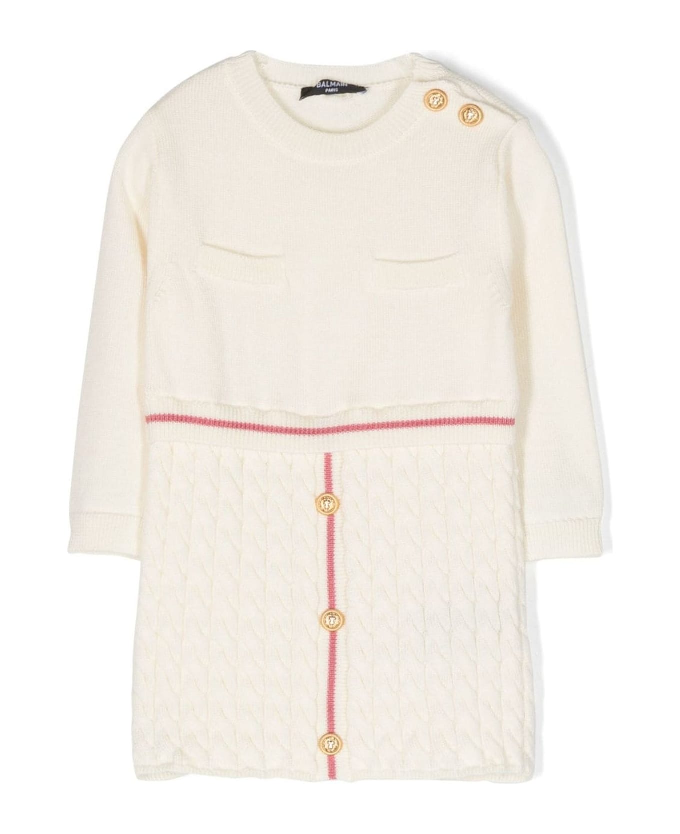 Ivory white virgin wool dress, cable knit, crew neck, side button fastening, long sleeves, two chest patch pockets, straight hem Composition: Virgin Wool, 100%