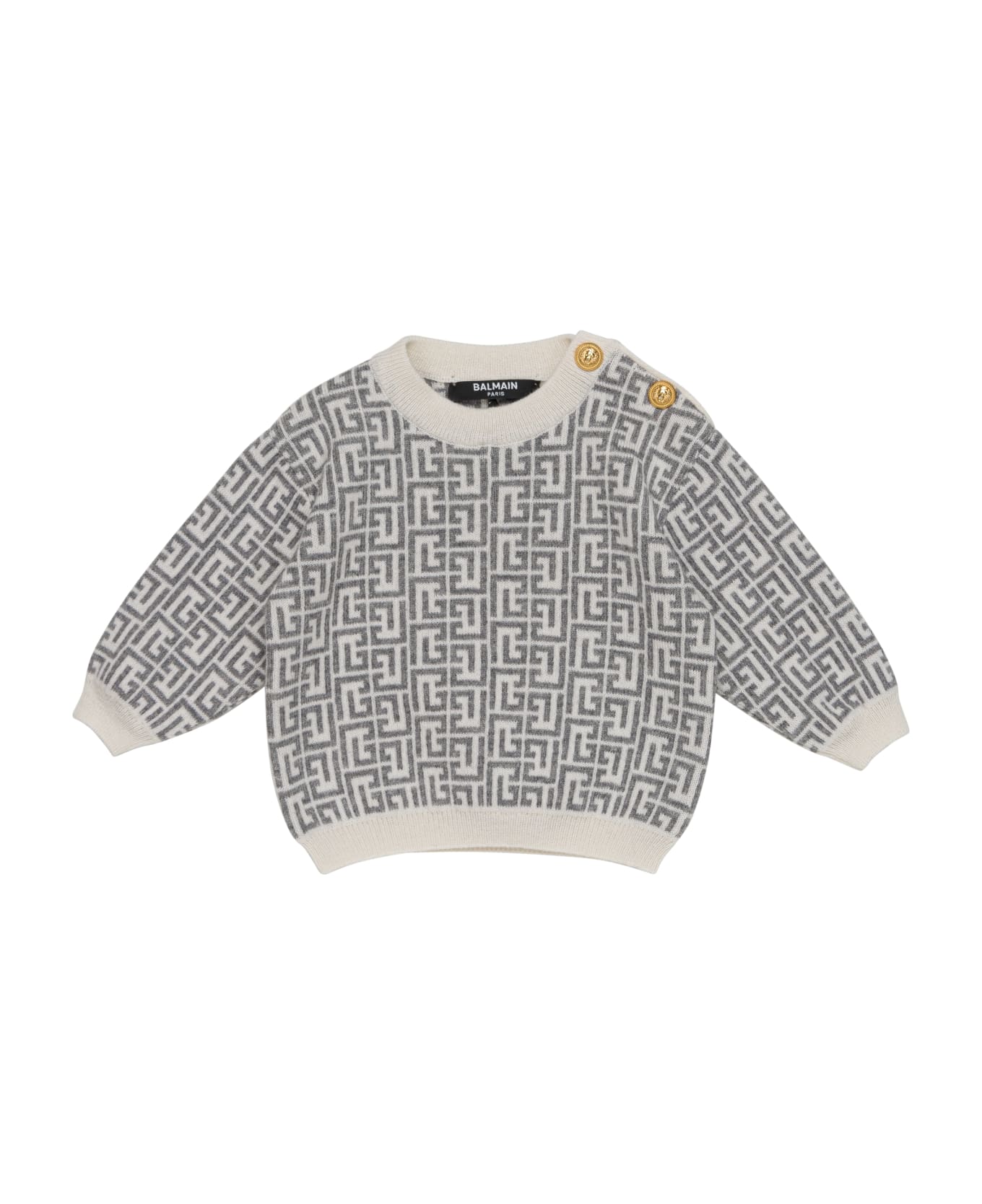 monogram-pattern wool-blend jumper from Balmain Kids featuring off-white, medium grey, merino wool blend, cashmere-silk blend, knitted construction, intarsia-knit logo, monogram pattern, gold-tone buttons, ribbed-knit edge, crew neck, button fastening at the shoulder, long sleeves and straight hem.
