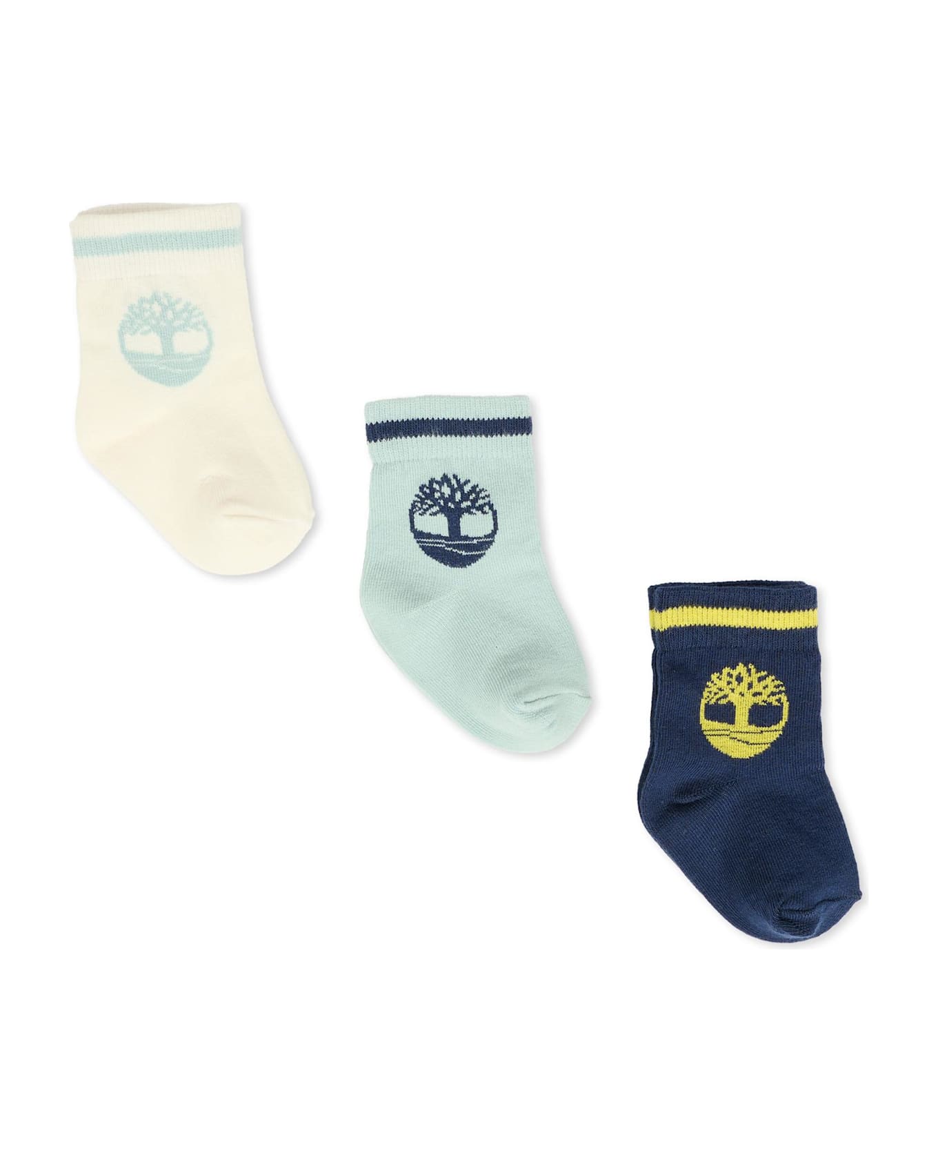 Multicolor sock set composed of three pairs of socks, blue, light blue, and white, with ribbed cuffs; white socks with light blue detail, blue socks with lime yellow detail, light blue socks with blue detail; they are embellised with a logo on the sides.