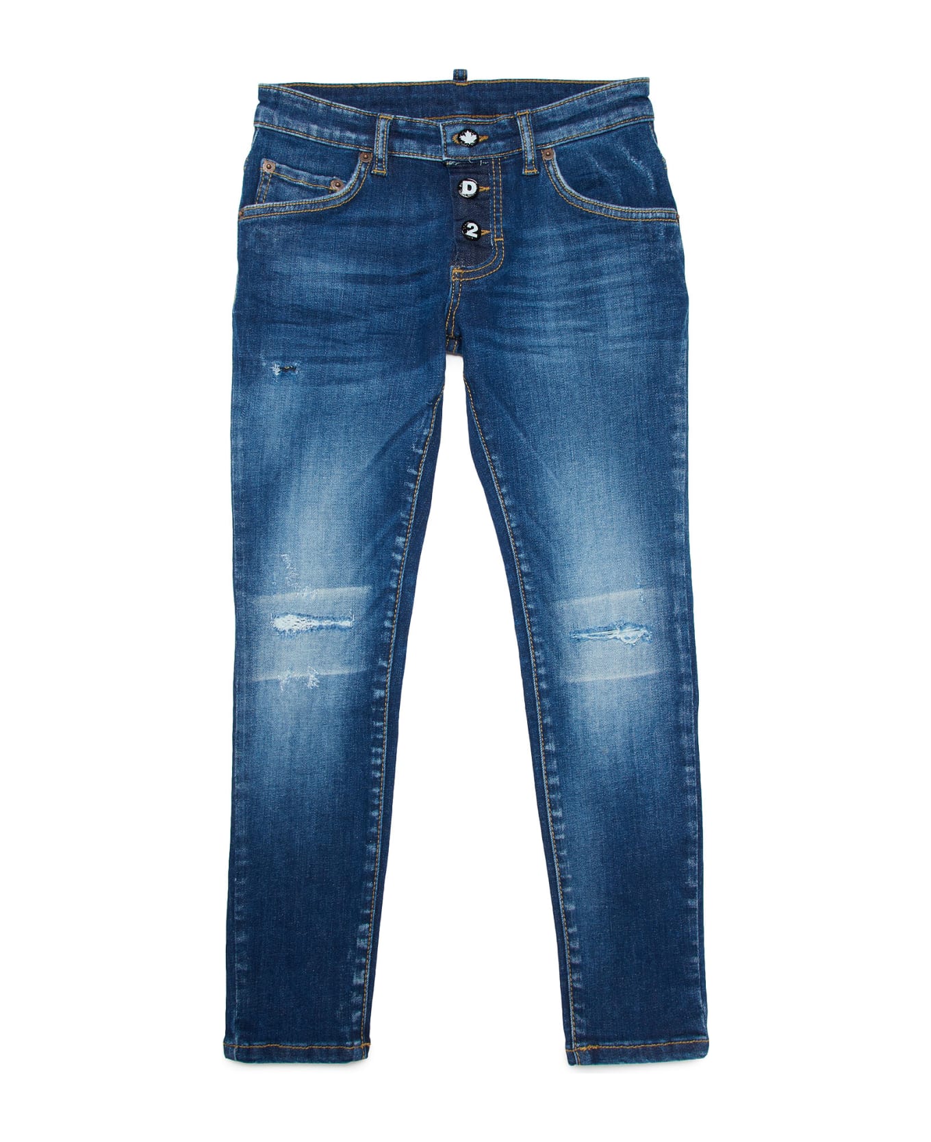 Blue denim trousers boy. Distressed effect, skinny fit, back logo patch, skinny fit and straight fit. Cotton 98%, Elastane 2%
