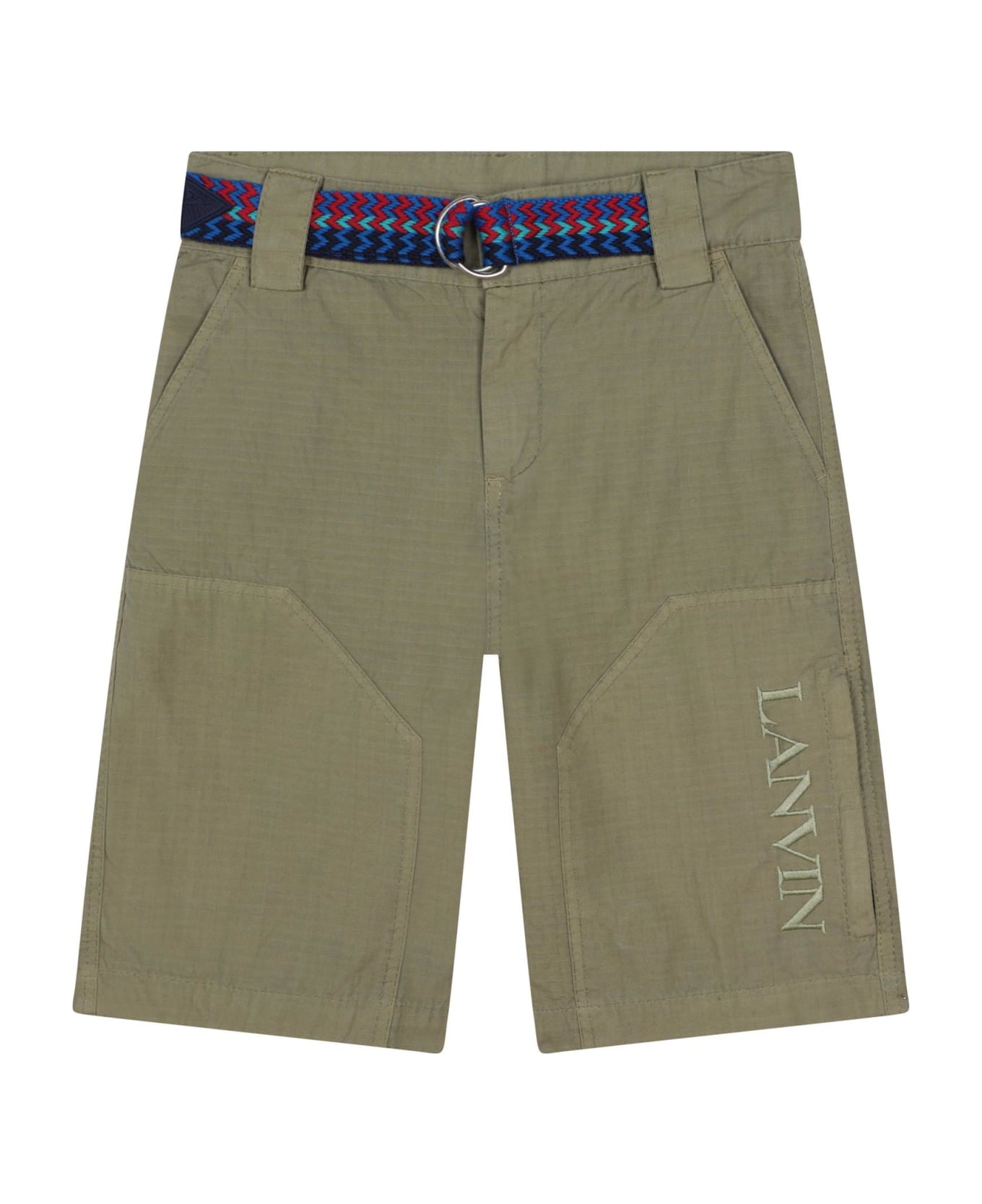 logo-embroidered chino shorts from Lanvin Enfant featuring forest green, cotton, embroidered logo to the side, belt loops, D-ring buckle fastening, concealed front fastening, two diagonal pockets to the sides, side zip-fastening pocket and straight leg. Composition: Cotone, 100%