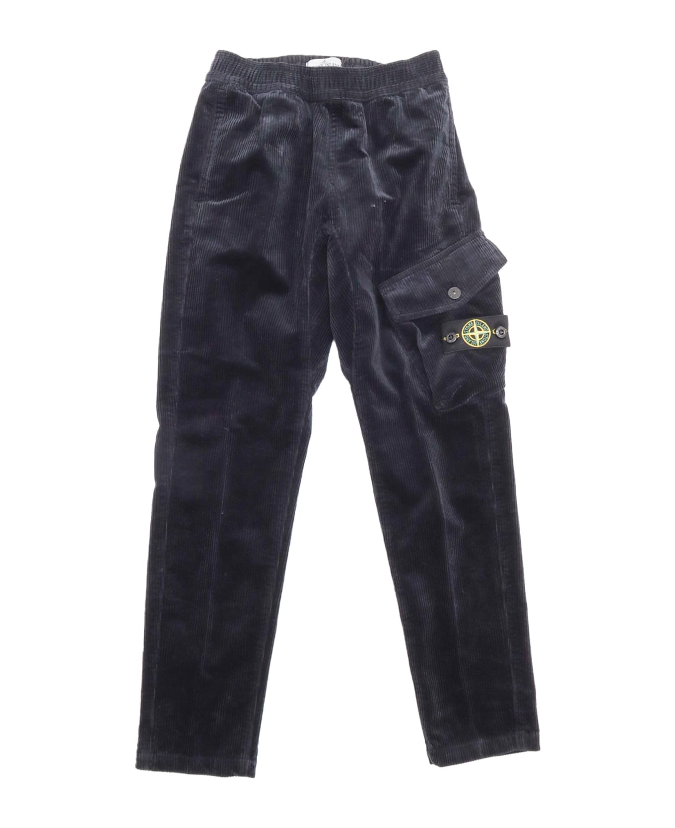 Dark blue corduroy pants, side pockets, removable logo label, zipped side pocket, back pockets, belt loops, elasticated waist Composition: 75% Cotton 24% Lyocell 1% Elastane / Spandex