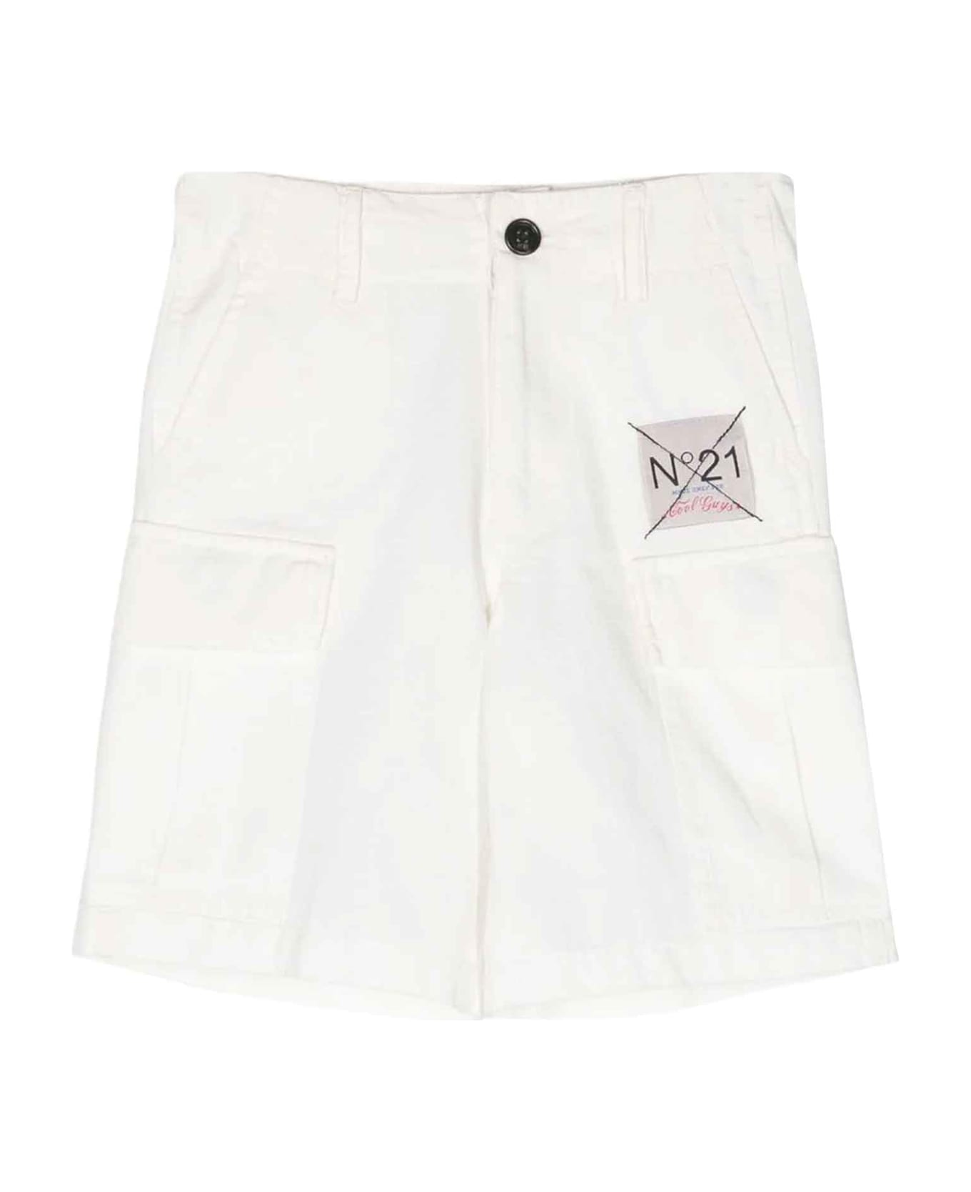 White shorts boy Nº21 Kids. Front application with logo, belt loops, front closure with buttons and zip, two diagonal side pockets, two side pockets with flaps and two back pockets with flaps. 100% Cotton