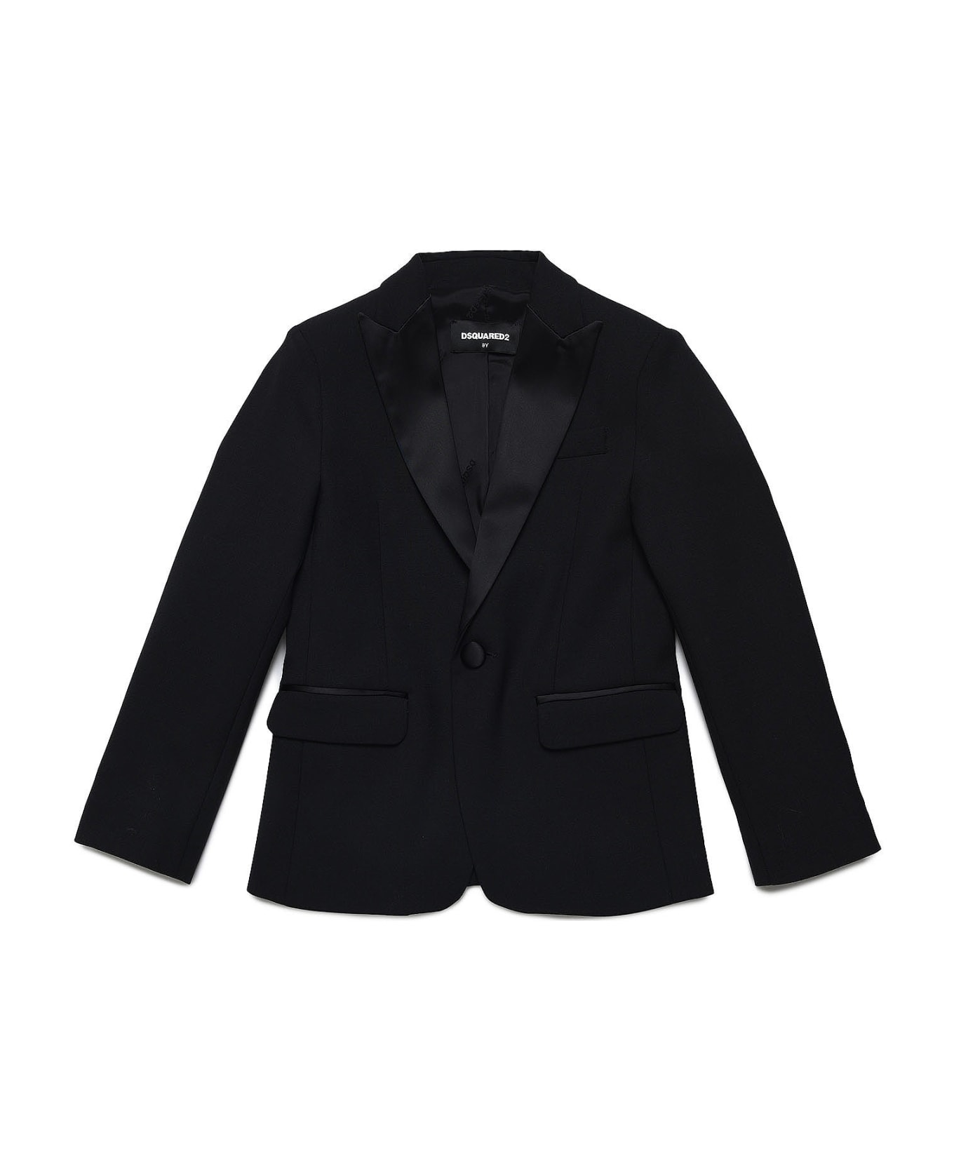 Black blazer boy. Satin border, contrasting lapels and front closure with buttons. Virgin Wool 95%, Acetate 76%, Nylon 21%, Spandex/Elastane 5%