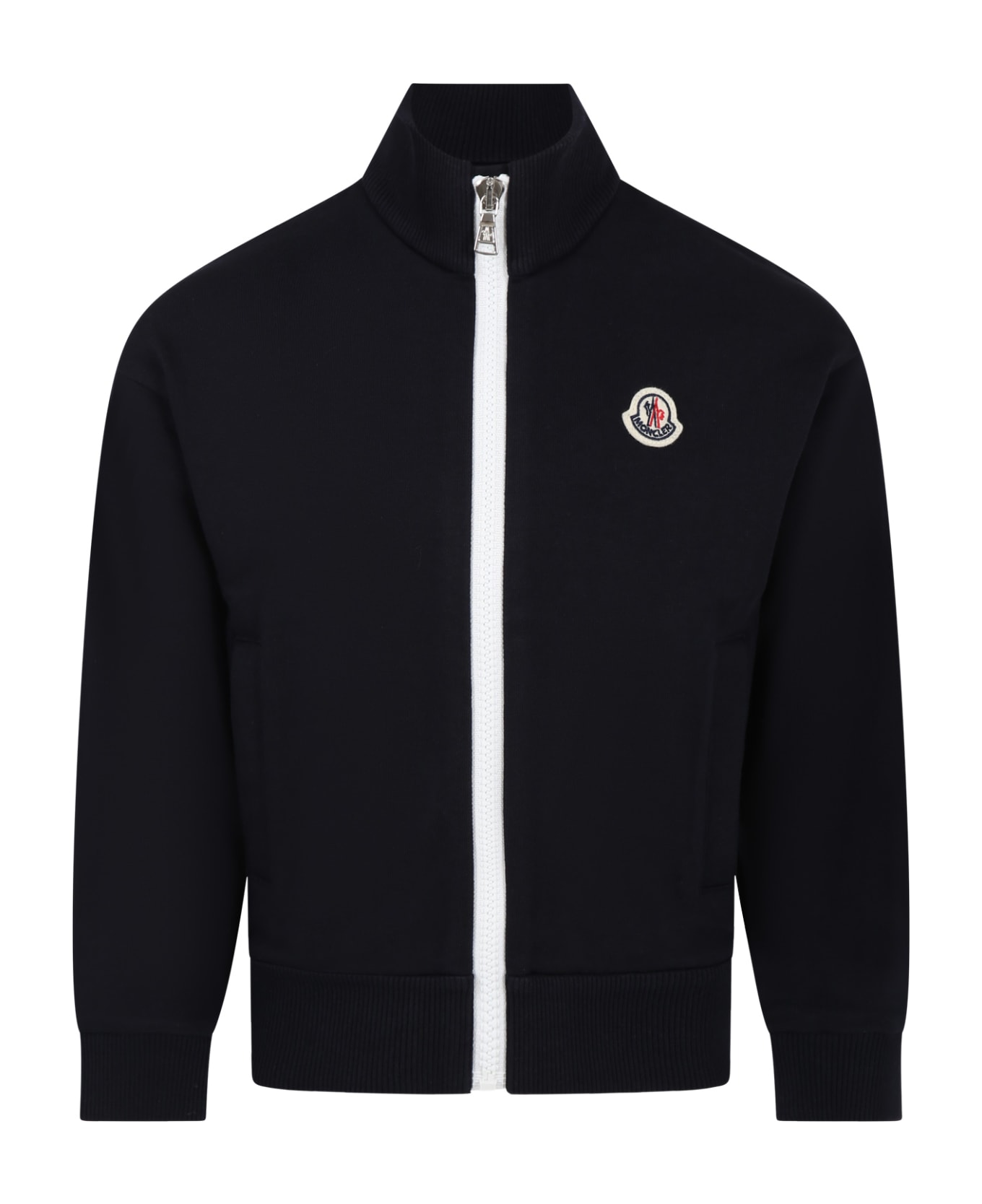 Blue sweatshirt, in brushed cotton, with long sleeves, ribbed collar, cuffs and hem, zip closure and front pockets. She is embellished with logo patch on the chest, with multicolor logo, on the back.
