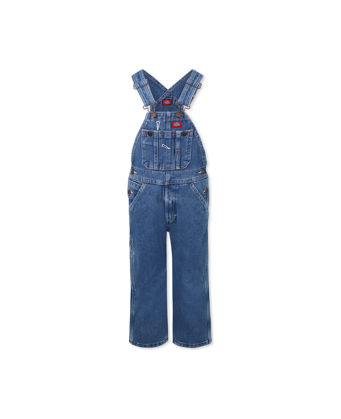 Cotton denim dungarees, with adjustable braces, hooks, buttons on the sides, side pockets, back and front pocket. It is embellished with logoed patch on the front and back.