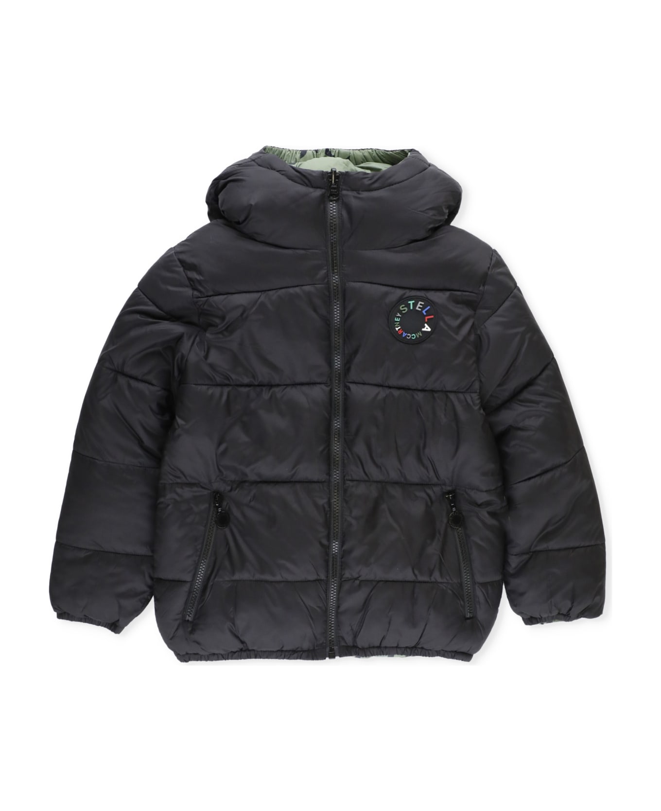 - Black Stella Mc Cartney boy's reversible jacket - Collar - Long sleeves with elastic at hem - Two side zip pockets - Front loged patch - Front zip fastening - Two interior slit pockets - Interior contrasting color loged print