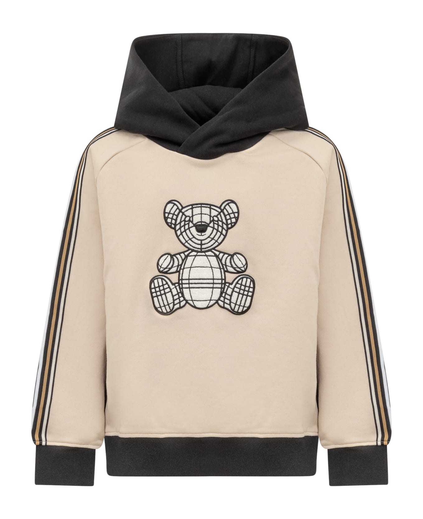 Hoodie. Bear patch on the front. Striped bands on the sleeves.
