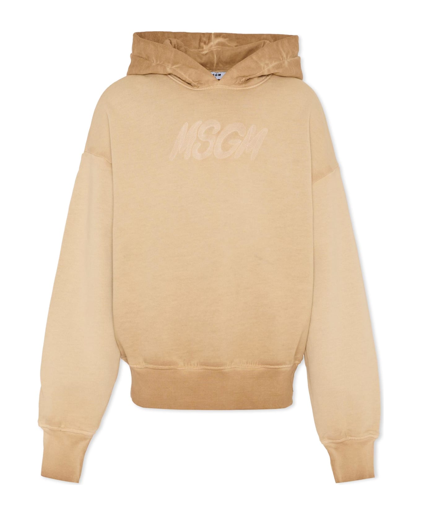 Beige faded sweatshirt in brushed cotton, long sleeves, hood, ribbed cuffs and hem. It is embellished with an embroidered logo on the front.