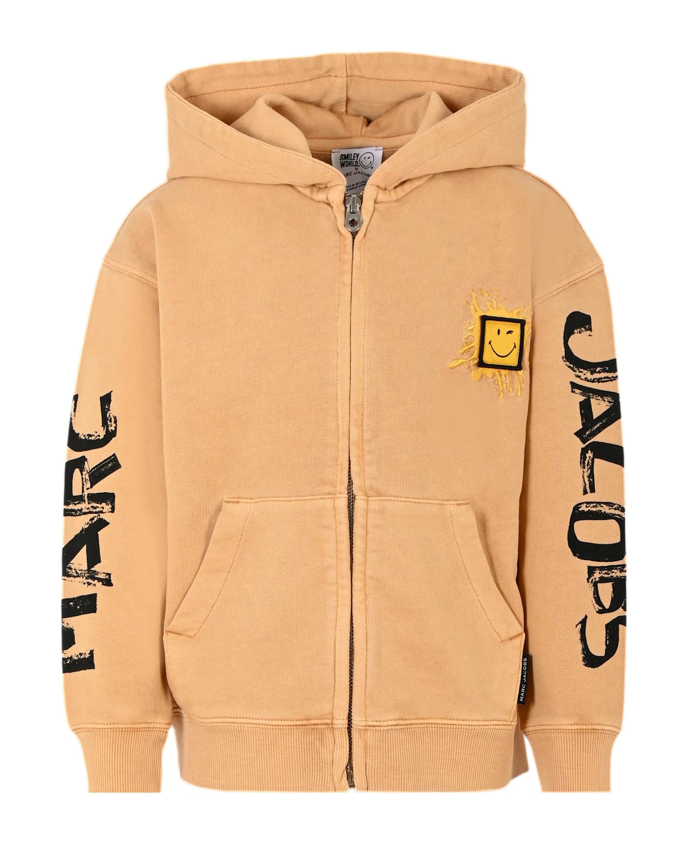 Brown brushed organic cotton sweatshirt, with long sleeves, a hood, a front zip fastening, side pockets, and ribbed cuffs and hem. It is embellished an embroidered smiley patch on the chest and a logo on the sleeves.