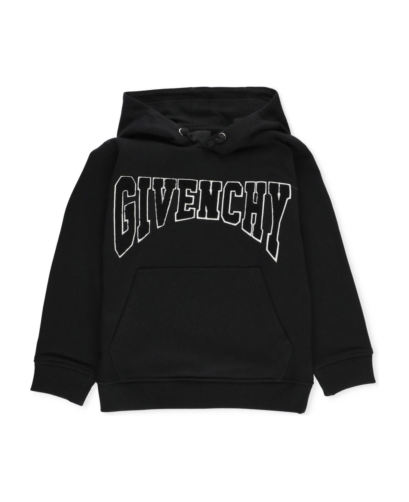 - Black Givenchy Junior cotton hoodie for boy - Long sleeves - Elastic ribbed trims - Front Kangaroo pocket - Front contrasting fabric logo Composition: 86% Cotton, 14% Polyester Trims:, 98% Cotton, 2% Elastane