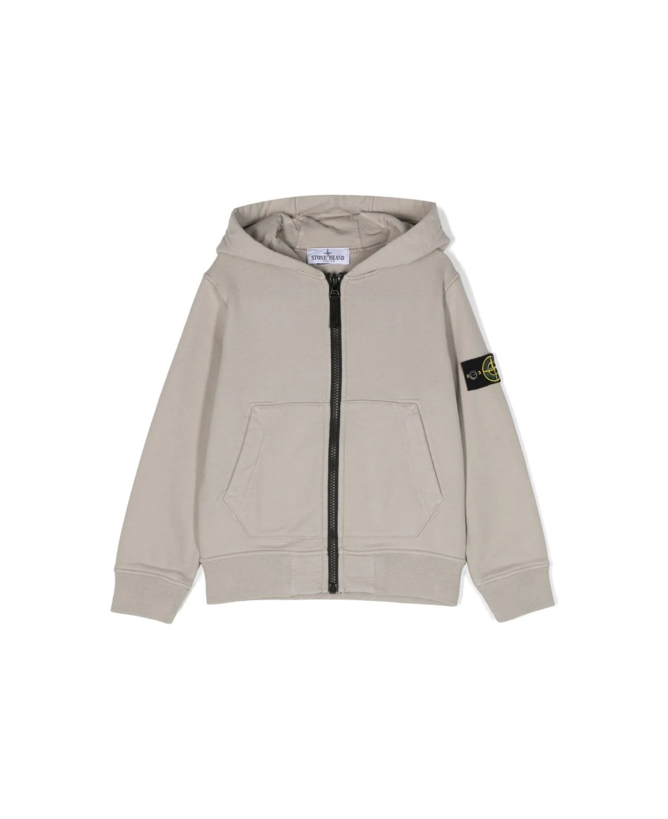 Stone Island full-zip hoodie made of dove grey, garment-dyed plush cotton. Hood lined in lightweight cotton jersey. Patch pockets with slanted entry. Stone Island crest on left sleeve. Ribbed cuffs and hem. Stitched and lined half-moon detail under the back neckline. Zip fastening.