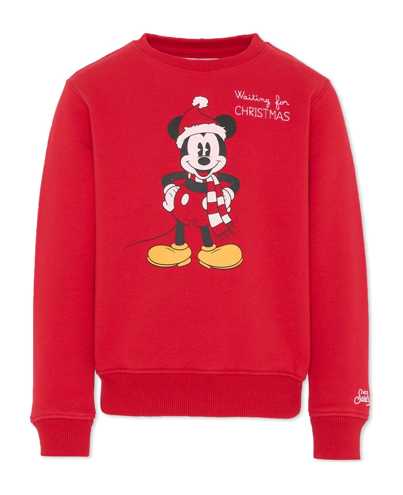 Red sweatshirt in a cotton blend with long sleeves, a crew neck, ribbed cuffs, and hem. It is embellished with a Mickey Mouse print on the front and an embroidered logo on the sleeve. This is a Disney x Mc2 Saint Barth collaboration.
