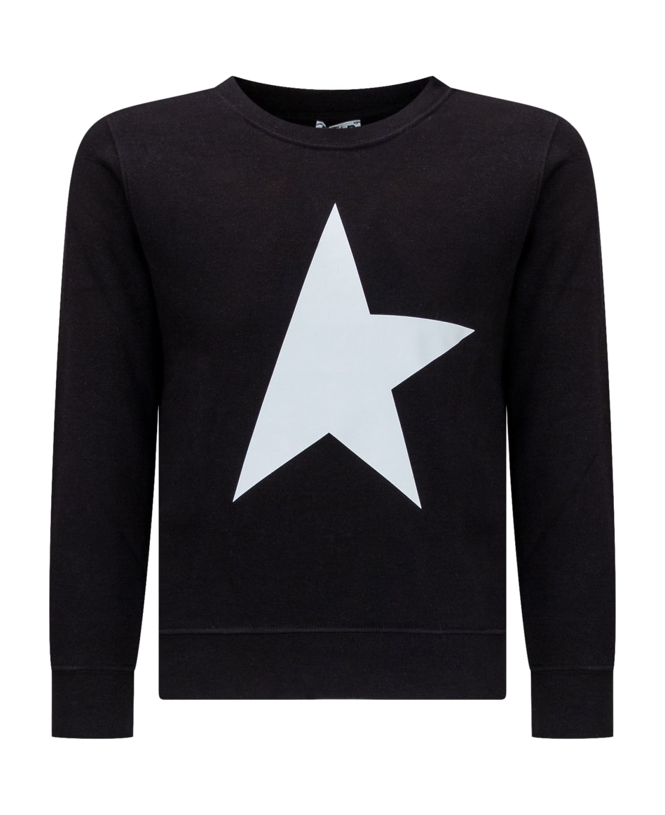 Black sweater with long sleeves. Crew neck. Ribbed collar, cuffs and bottom. Print on the front. Logo on the back of the neck.