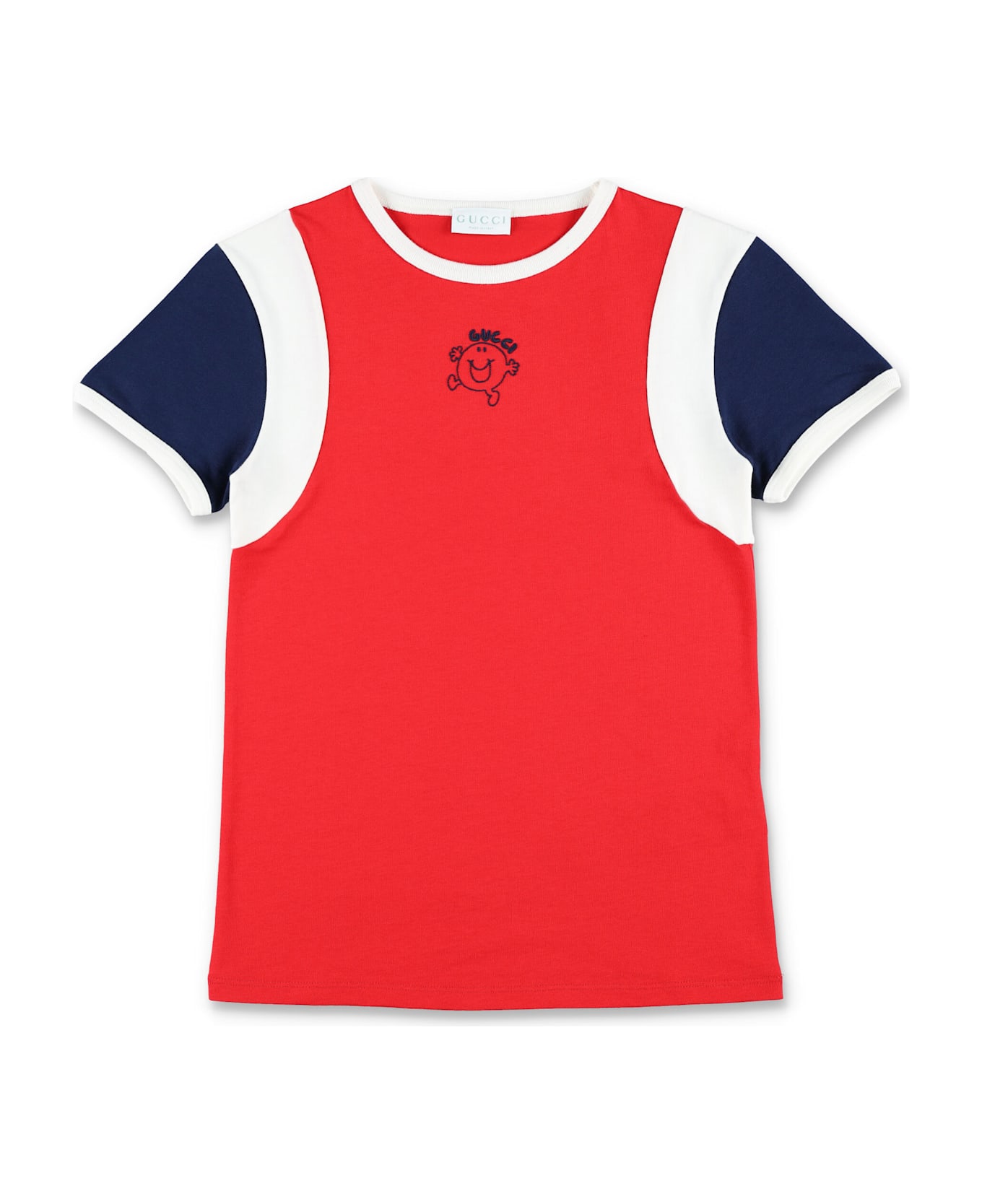 This Gucci Kids T-shirt Blends The House s Iconic Language With A Playful Narrative. Crafted From Cotton Jersey In Red, White And Dark Blue, It Features A Relaxed Silhouette With Dropped Shoulders And Short Sleeves. The Front Is Enriched With Embroidered Gucci And Mr. Men Little Miss Characters, Adding A Distinctive And Joyful Accent. Contrasting Inserts And Ribbed Trims Complete The Design, Creating A Statement Piece With Contemporary Appeal. Cotton Jersey In Red, White And Dark Blue