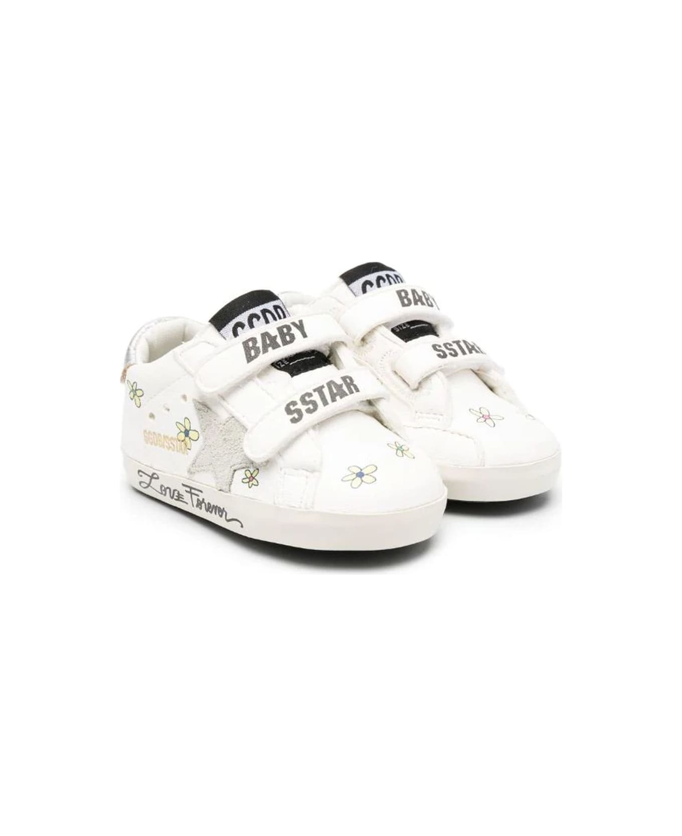 white leather sneakers smooth grain signature star patch to the sides all-over floral print text print logo patch at the tongue round toe front touch-strap fastening flat rubber sole