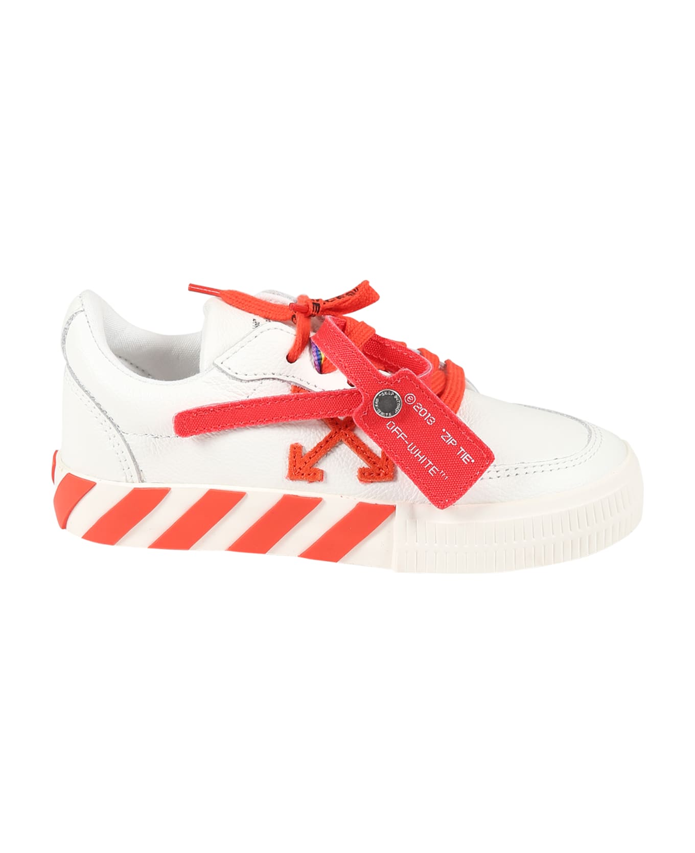 White sneakers, with rubber sole, lace-up closure on the top; decorated with iconic red arrows on the sole, iconic red zip tye on the top, orange detail, iconic red arrows, on the sides. They have a double lace, one red and the other multicolour.