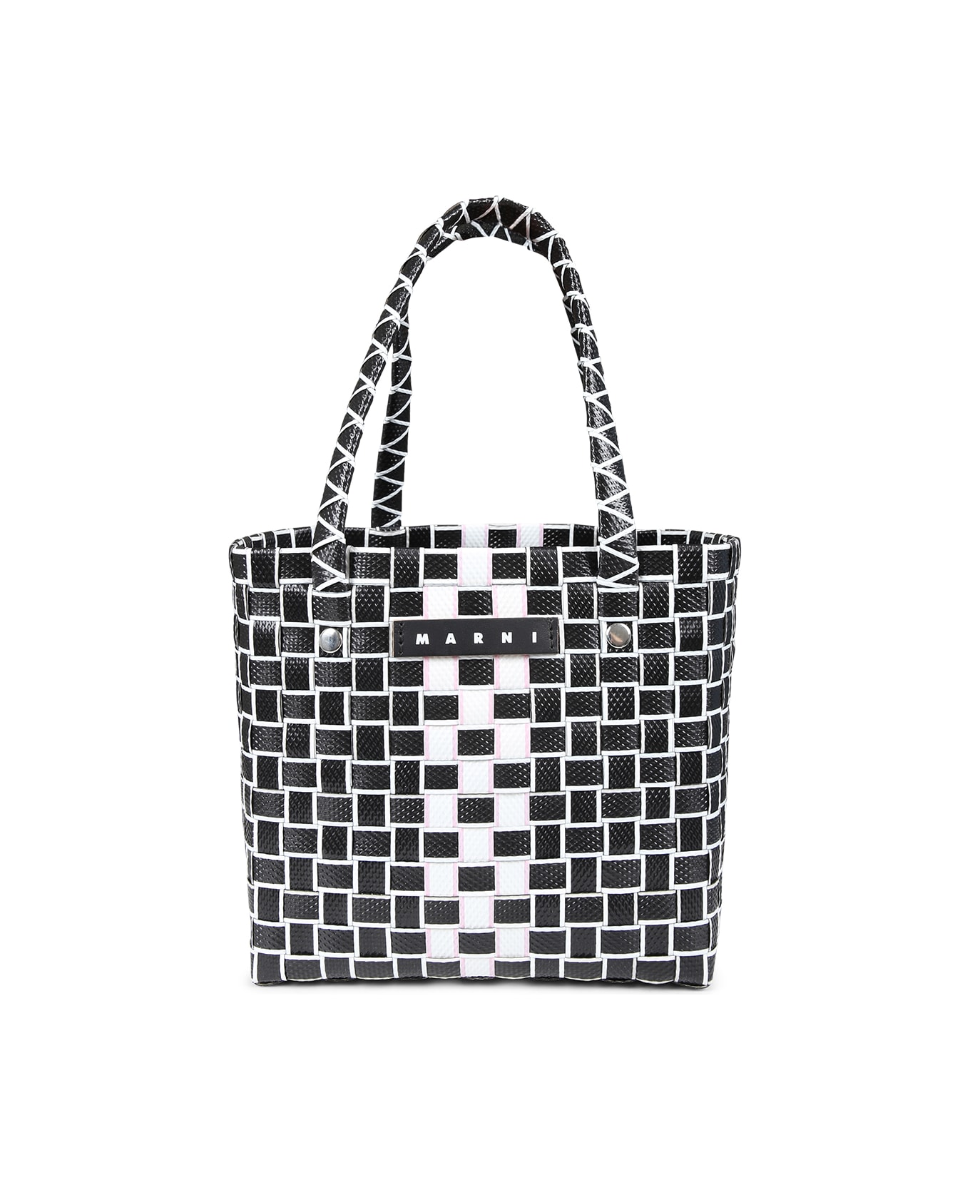 Black checked bag, with handles and pink details. It is embellished with a logoed label applied on the front.