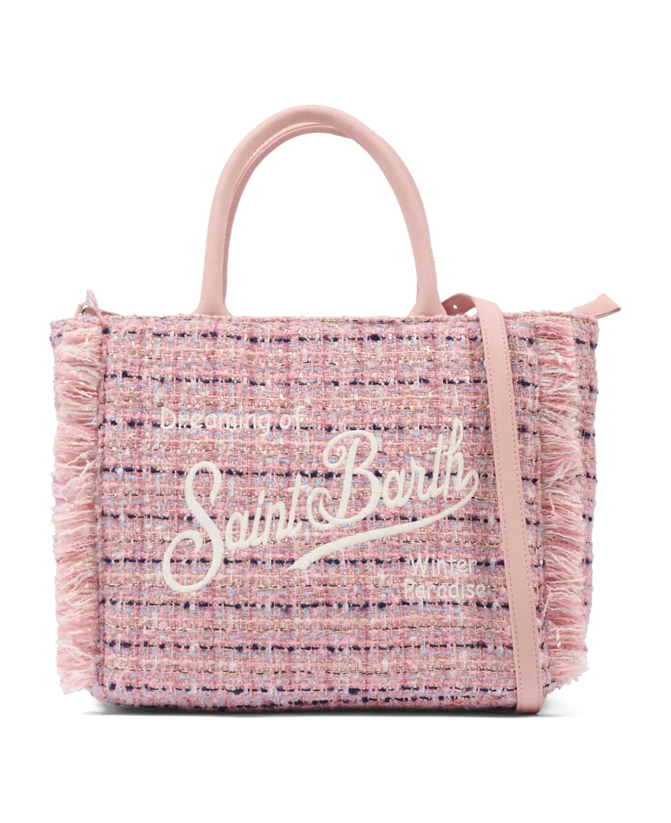 Lilac tweed and lurex bag with top handles, an adjustable and removable shoulder strap, a zip closure, and fringe. It is embellished with an embroidered logo on the front and back.