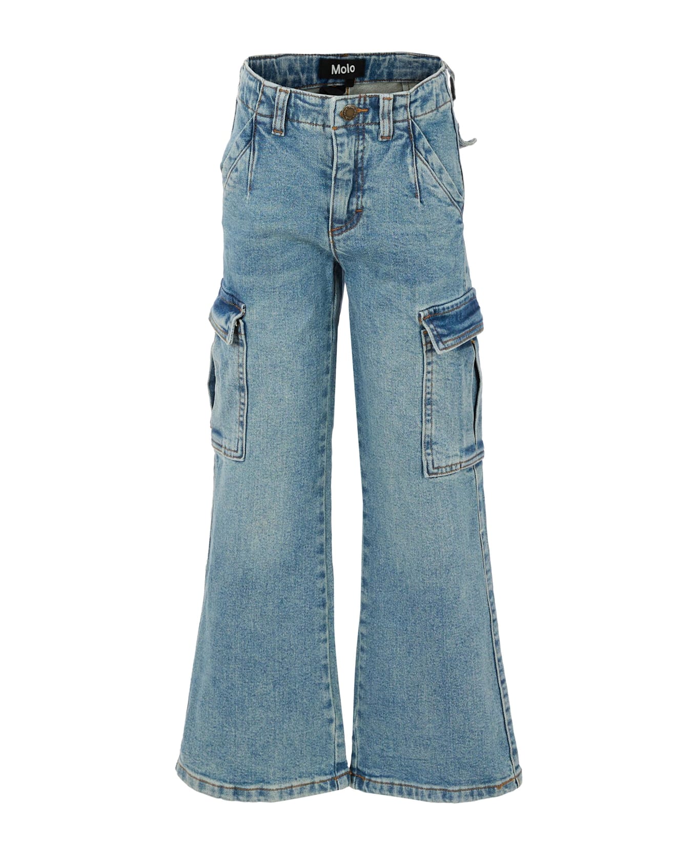 Blue flared jeans, with front zip and snap button fastening, belt loops, side pockets, cargo pockets on the sides and adjustable waist thanks to internal elastic with buttons. They are embellished with a logo patch on the back.