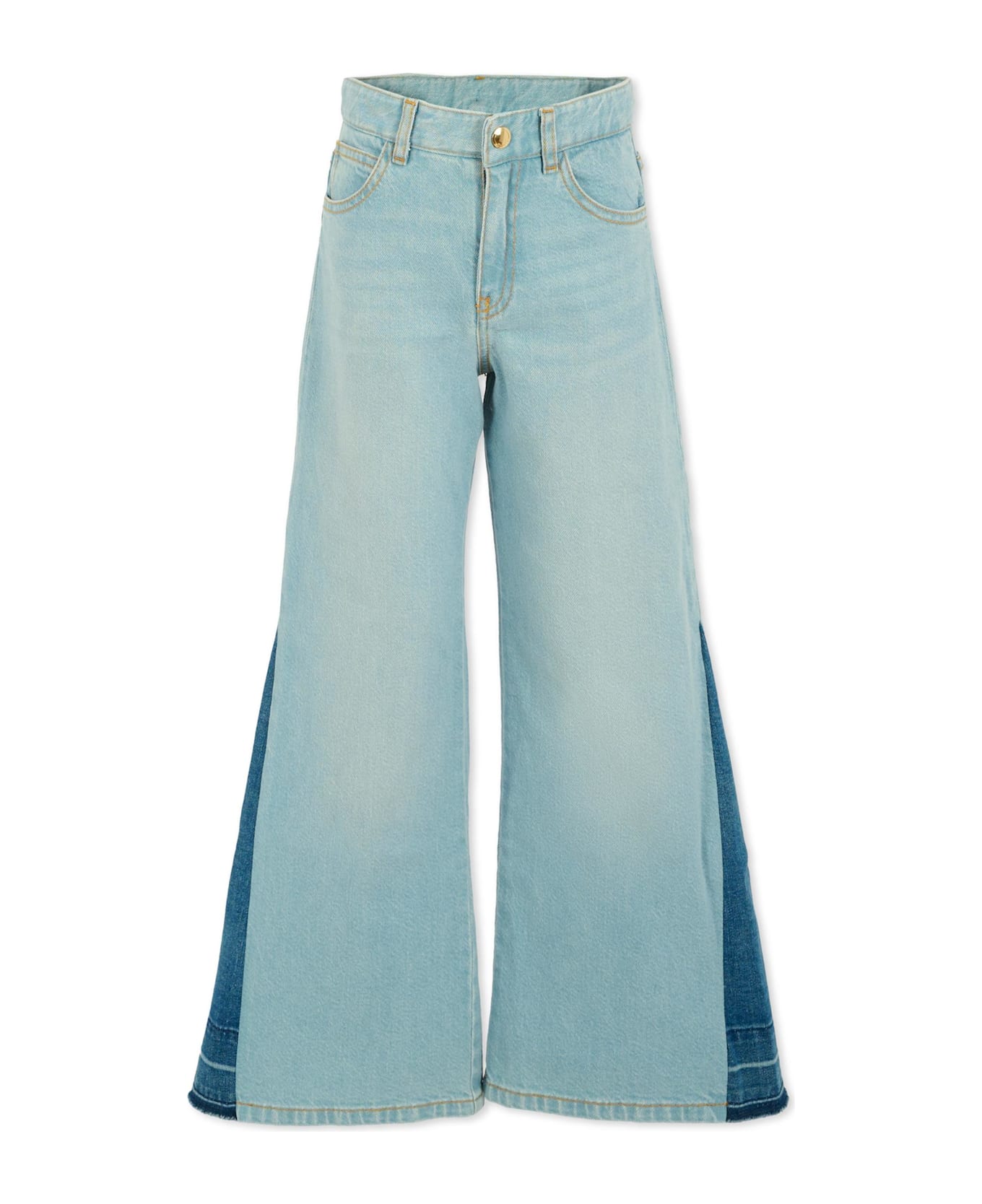 Five-pocket denim jeans with belt loops, a front zip and snap button closure, an adjustable waistband with internal buttons, and blue details on the bottom. They are embellished with a logo patch on the back.