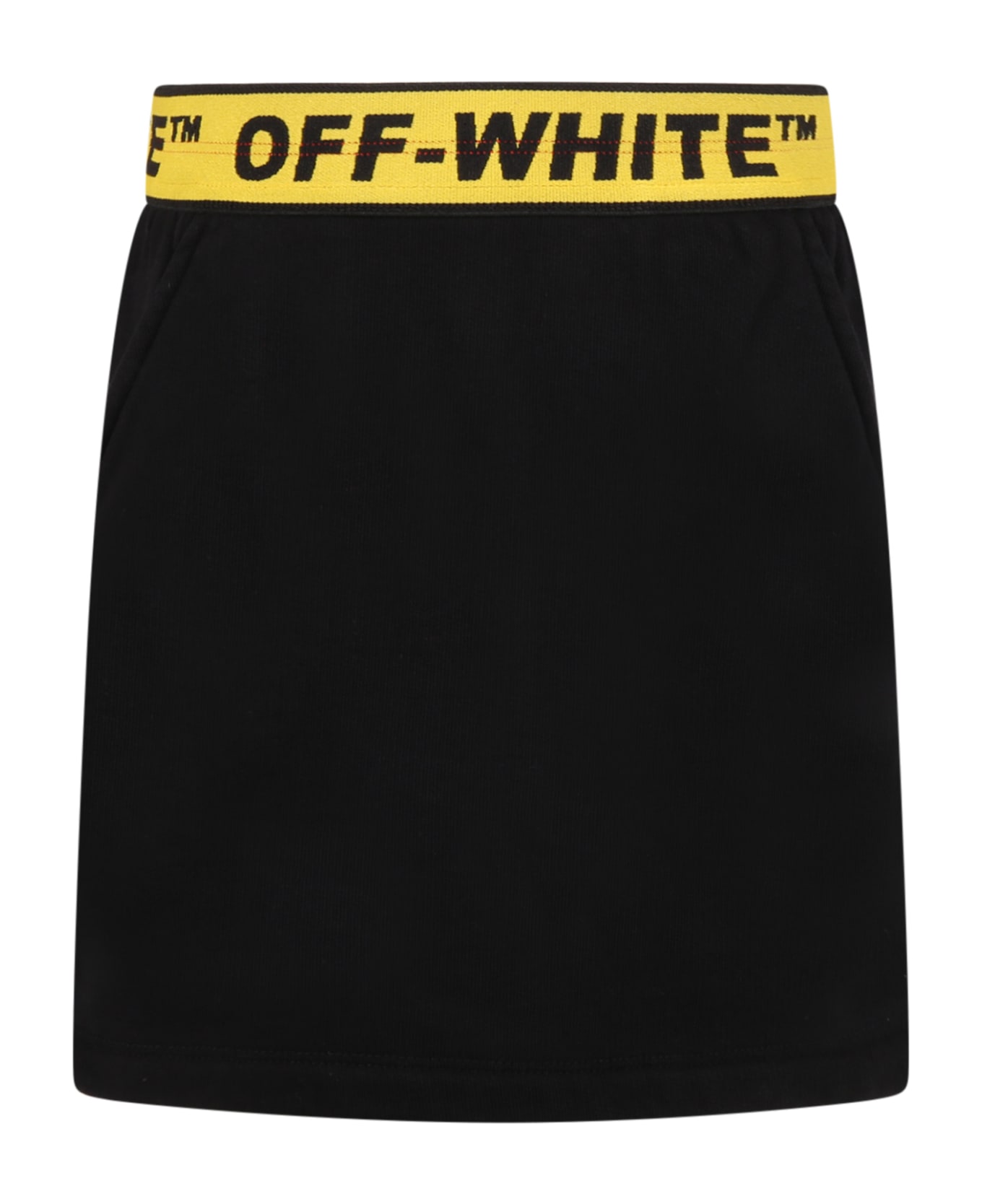 Colore: Nero Descrizione: Gonna nera, in cotone felpato, con elastico in vita giallo e tasche laterali. E' decorata con loghi neri, sull'elastico. Dettagli: 100% Cotone. Lavare a 30°C.