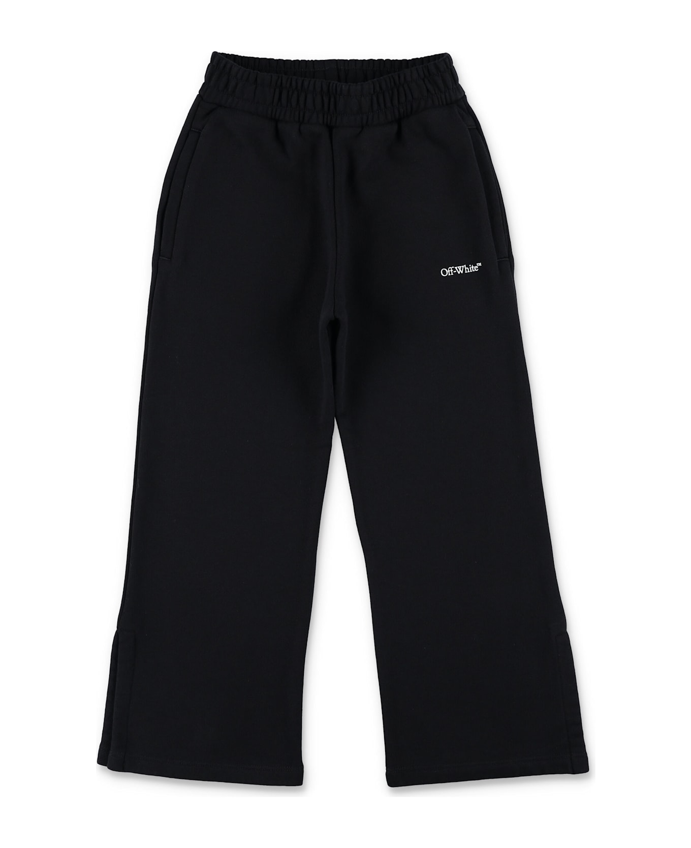 The Off-white Kids Wide Jogging Pants In Black Bring A Contemporary Twist To Classic Activewear. Crafted From Soft Brushed Cotton, They Ensure Comfort And Ease Of Movement, While The Wide-leg Cut Adds A Relaxed, Modern Silhouette. Finished With A Printed Logo On The Side, They Are The Perfect Choice For Kids Casual And Streetwear Outfits. Elasticated Waistband