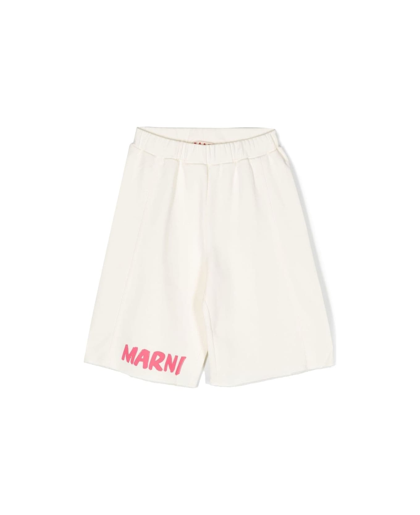 logo-print track shorts from MARNI KIDS featuring white, cotton, logo print at the leg, elasticated waistband, straight leg and raw-cut hem. Composition: Cotone, 100%