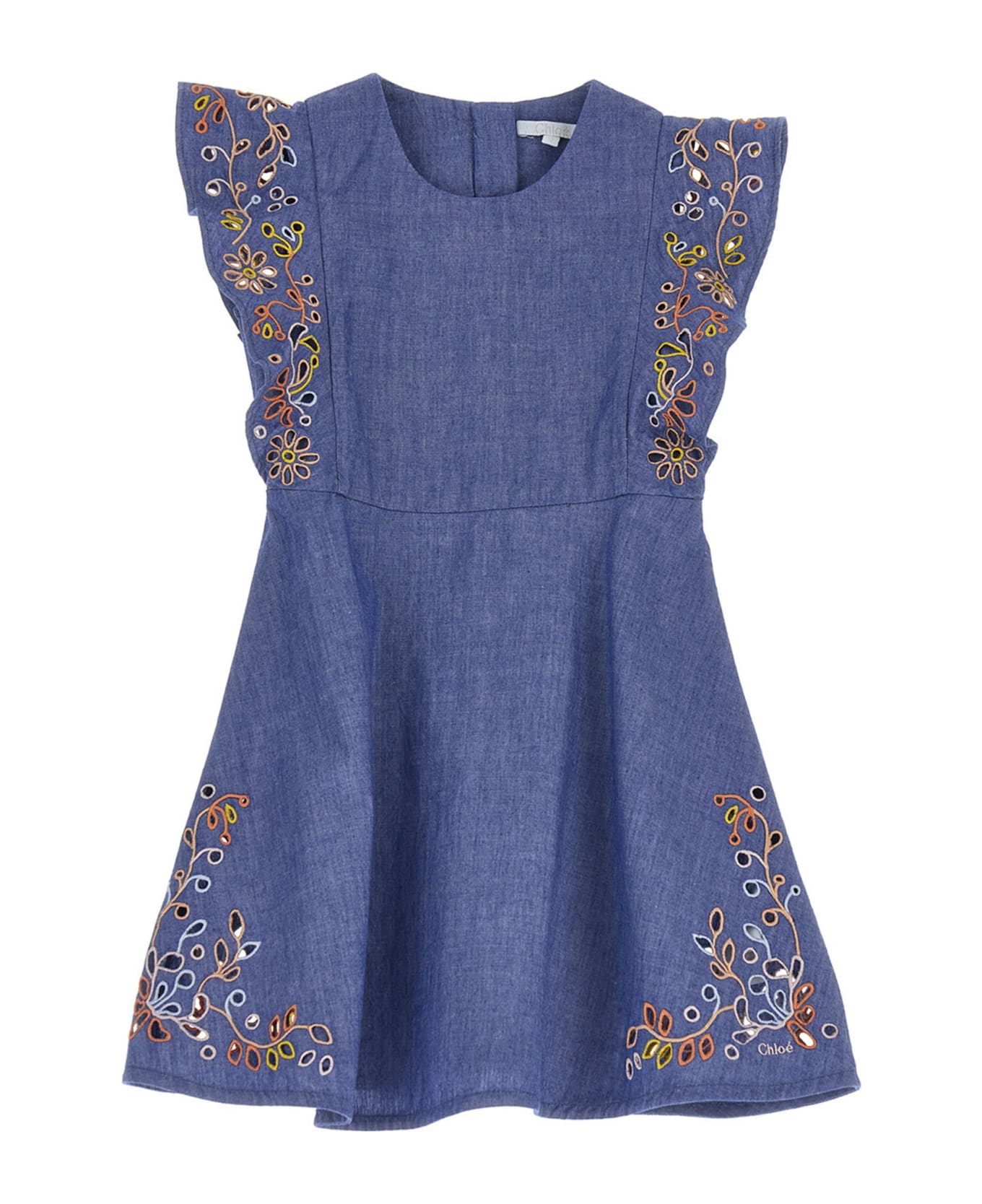 Cotton chamb rayon dress featuring contrast embroideries, rupches on the shoulders, crewneck, short sleeves and a back zip closure. Composition: 100% cotton