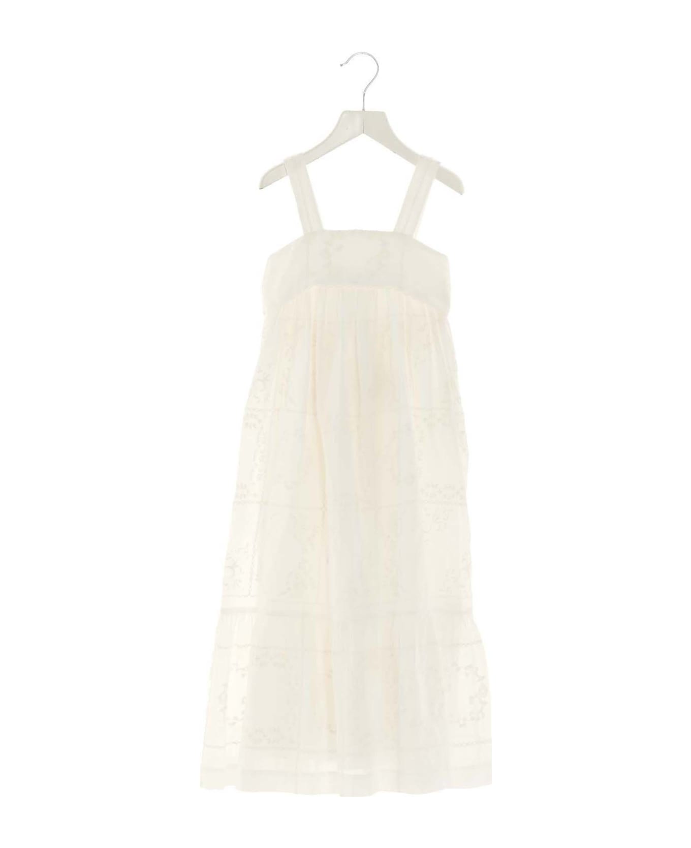 Cotton lace dress with lining, squared neckline, wide shoulders, a bow closure at the back.