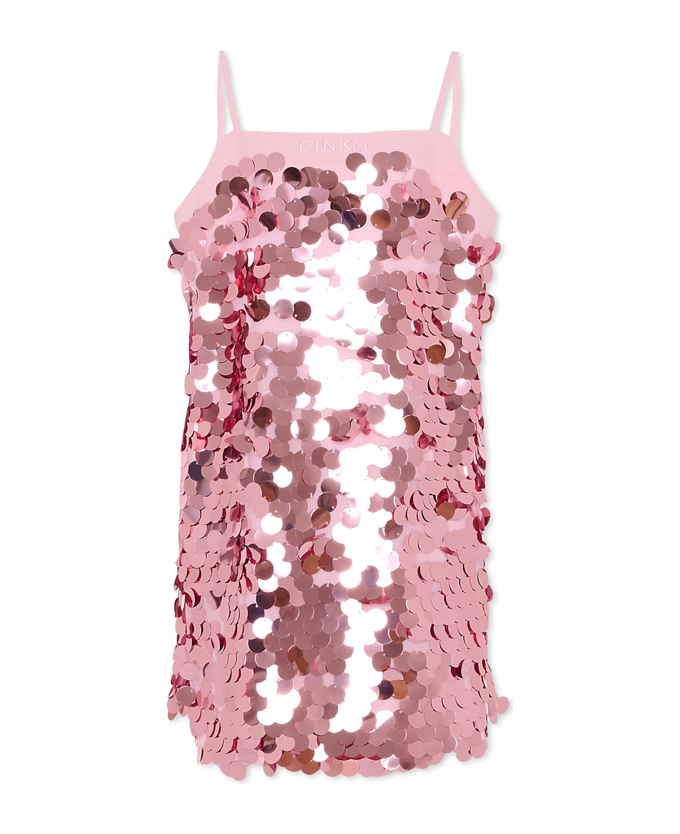 Pink sequin dress with straps and a square neckline. It is embellished with an embroidered front logo.