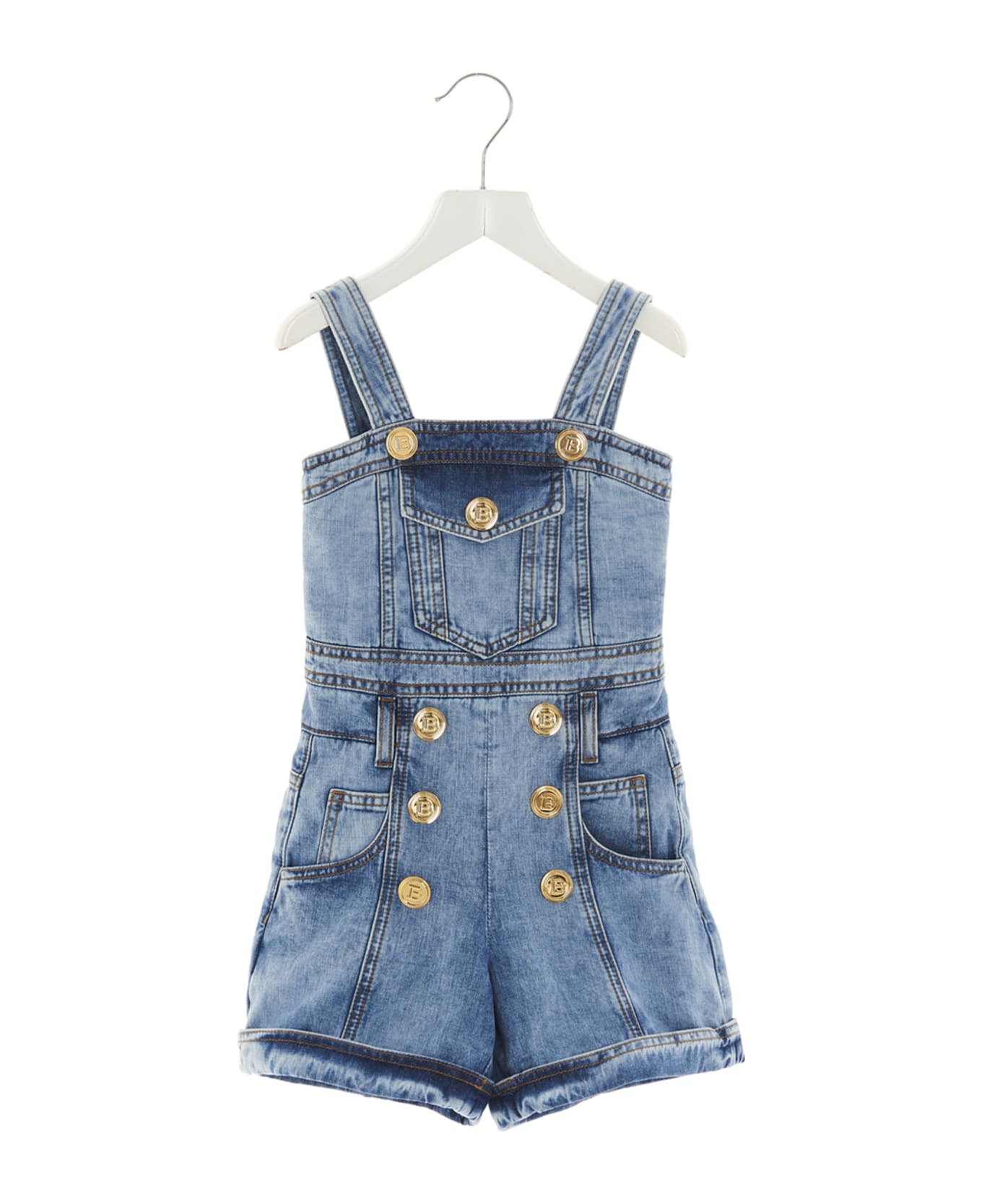 Stretch denim dungarees featuring gold logo buttons and a zip at the back.