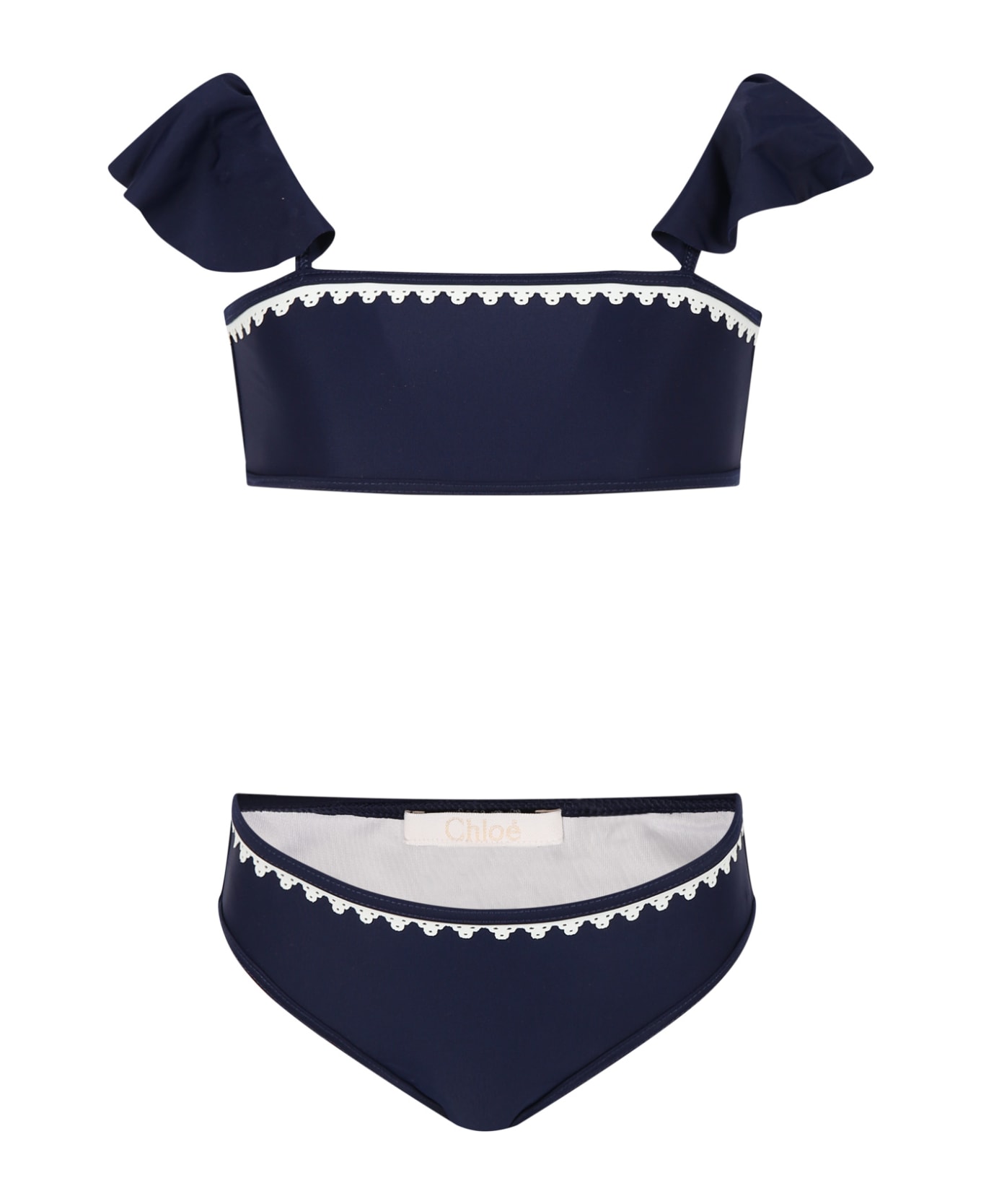 Blue bikini with ruffles on the sholder straps. It isembellisheded with white details.