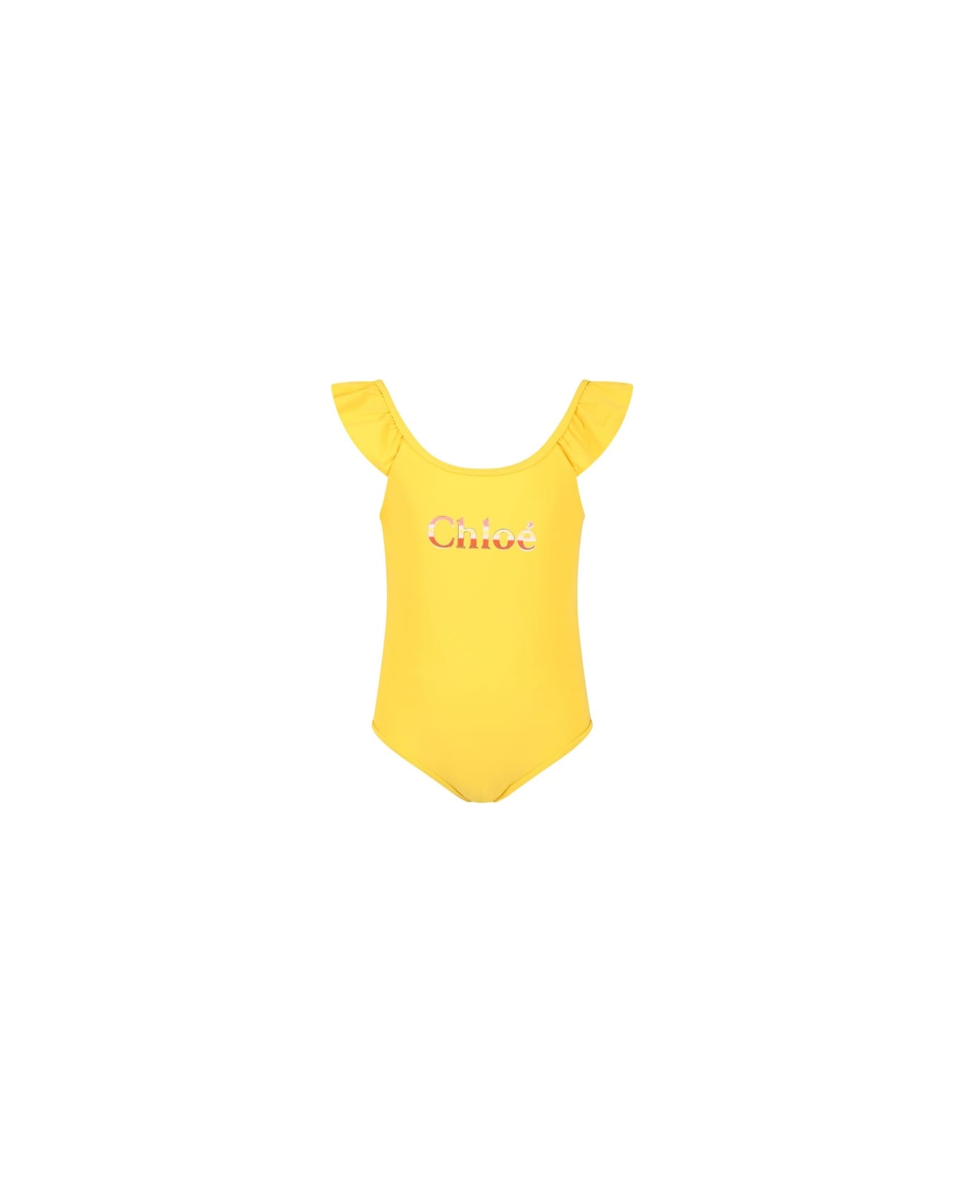 Costume giallo intero, con rouches sulle spalline. È decorato con iconico logo multicolor sulla parte anteriore.
