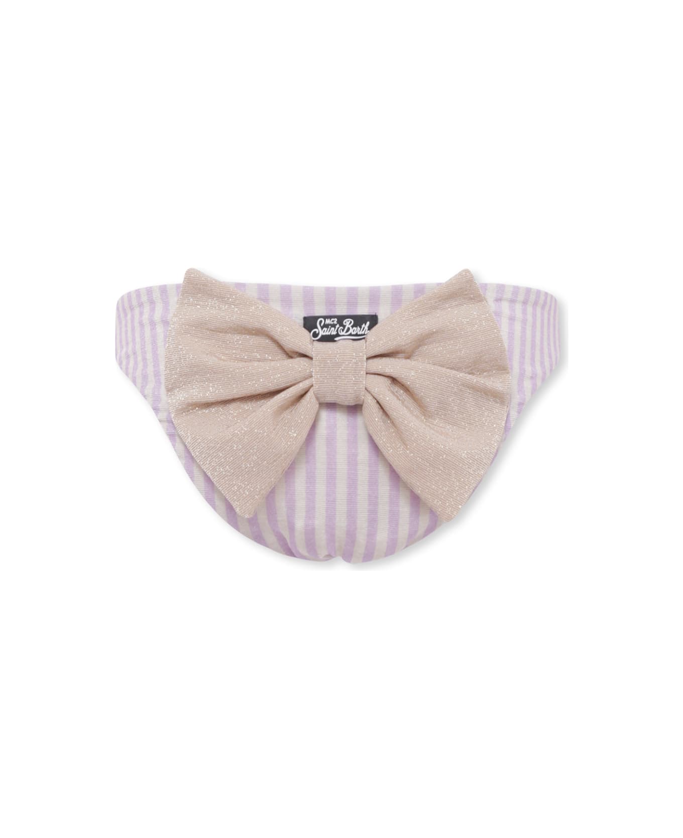 Lilac striped lurex swim briefs, with gold bow on the back. It is embellished with a logo patch on the back.