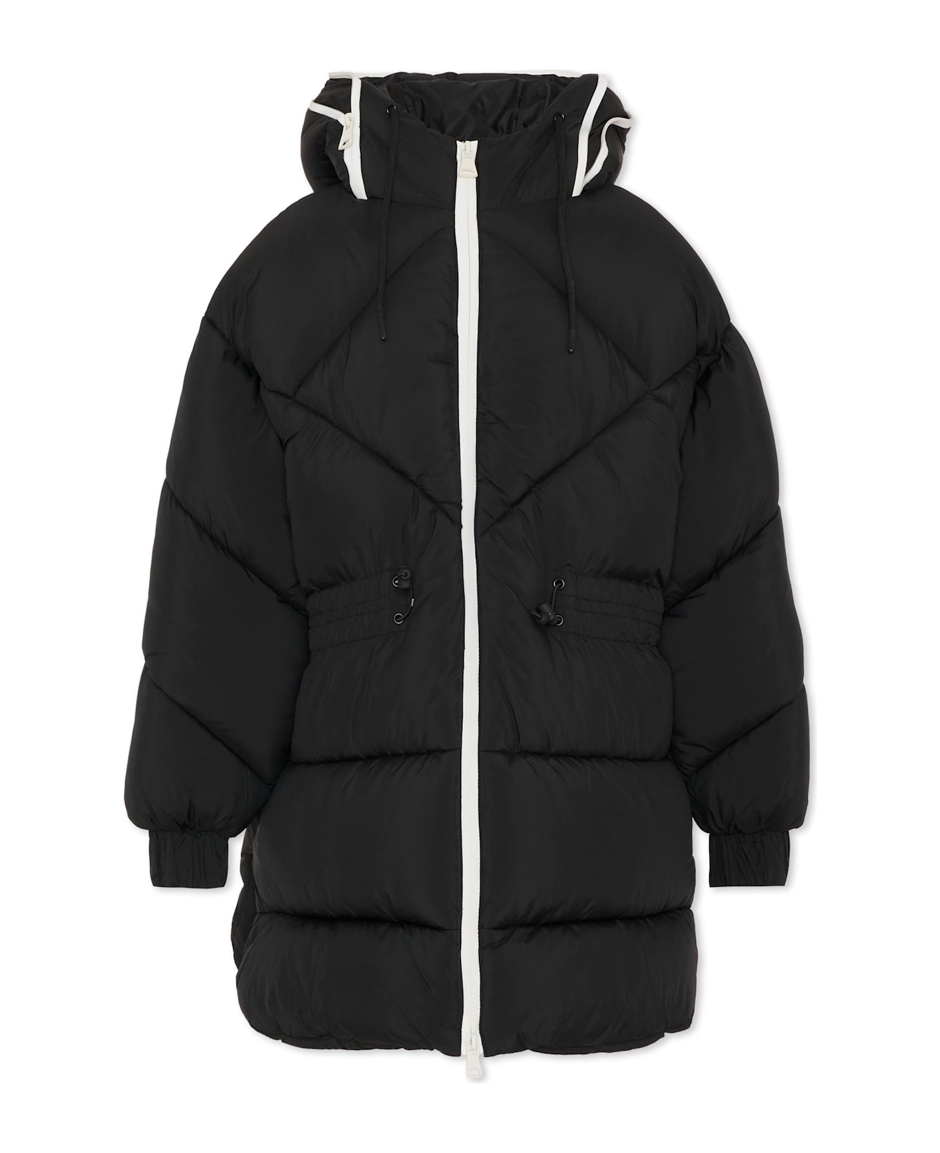 Long, heavy black down jacket, padded and quilted, with long sleeves, a zipped hood, a front zip fastening, side pockets with hidden zips, a drawstring waist, and elasticated cuffs. It is embellished with a logo on the hood and a rubber logo patch on the sleeve.