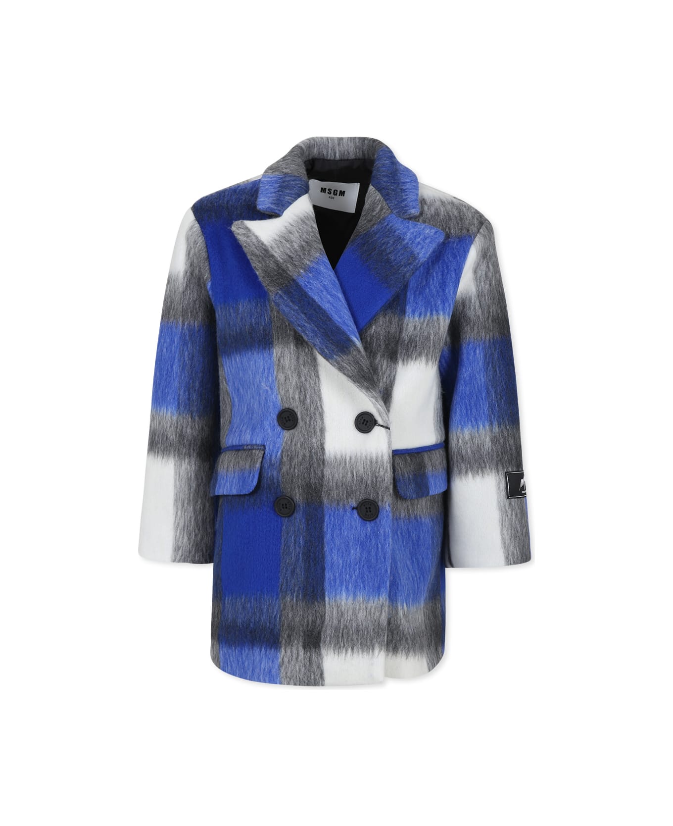 Double-breasted blue coat with brushed effect, long sleeves, lapel collar, front button closure, side pockets and vent on the back. It is embellished with a logo patch on the sleeve.
