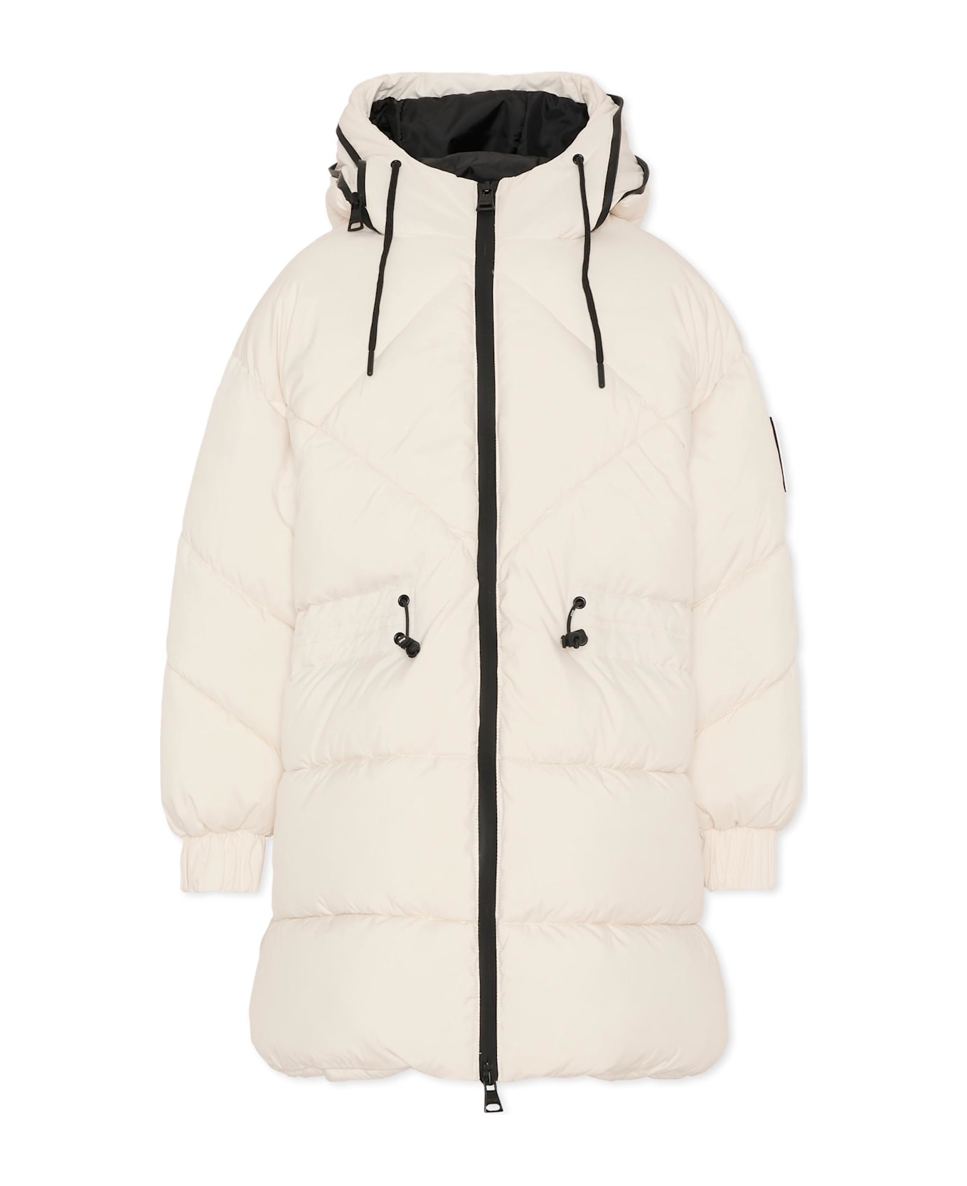 Long, heavy ivory down jacket, padded and quilted, with long sleeves, a zipped hood, a front zip fastening, side pockets with hidden zips, a drawstring waist, and elasticated cuffs. It is embellished with a logo on the hood and a rubber logo patch on the sleeve.