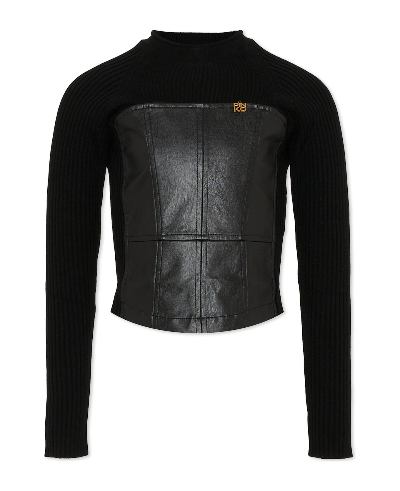 Black ribbed wool sweater with long sleeves, a crew neck, and a faux leather detail on the front. It is embellished with a metal logo on the front.