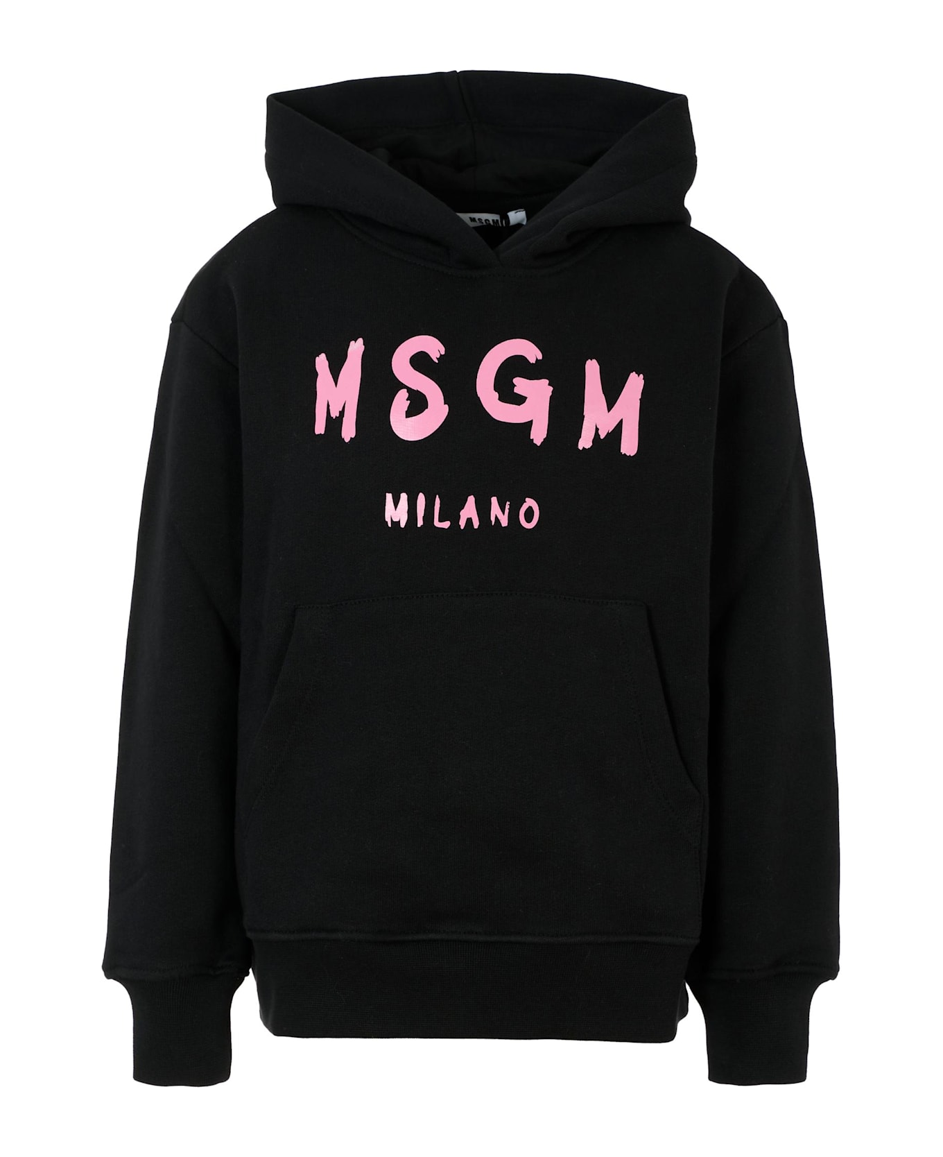 Black sweatshirt in fleece cotton, long sleeves, with hood, front pocket, ribbed cuffs and hem. It is embellished with a pink logo, printed on the front.