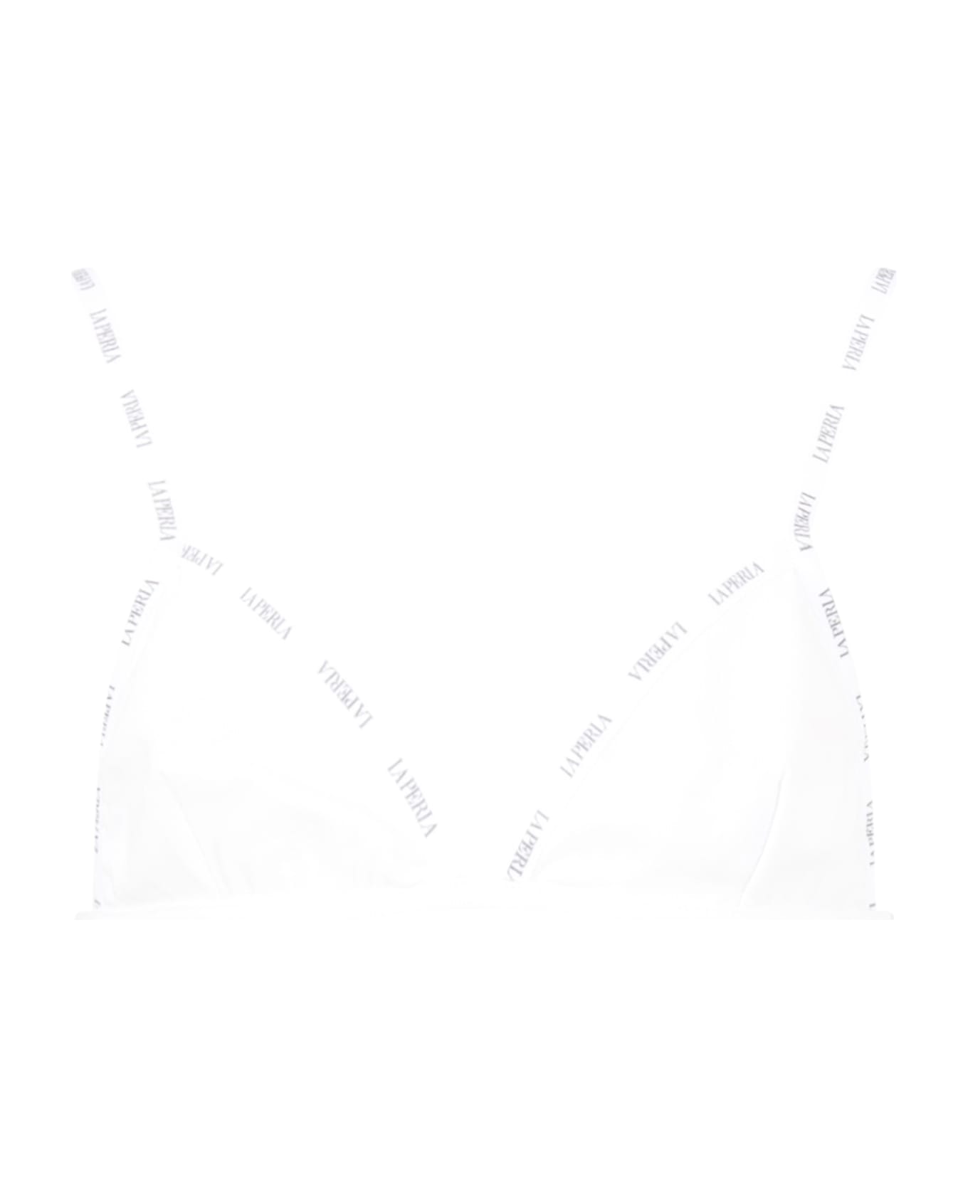White bra, with adjustable straps and hook closure, on the back. It is embellished with black logos.