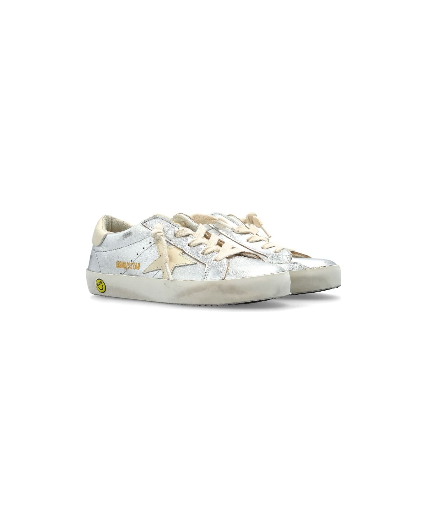 Sneakers superstar color argento chiusura frontale con lacci punta tonda suola in gomma Esterno: pelle di capra 100% Fodera: tessuto 100%, pelle di vitello 100% Suola: gomma 100%