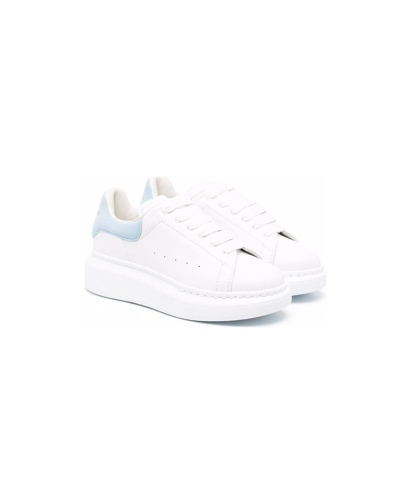 White Oversize sneakers by Alexander McQueen Kids made of soft calf leather with light blue suede spoiler. Iconic model of the brand characterized by round toe, white flat laces, oversized white rubber sole, silver Alexander McQueen logo on the spoiler and on the front tongue. A pair of extra laces included. To reduce the environmental impact and the consumption of cotton, the brand has decided to no longer provide the special bag for sneakers.