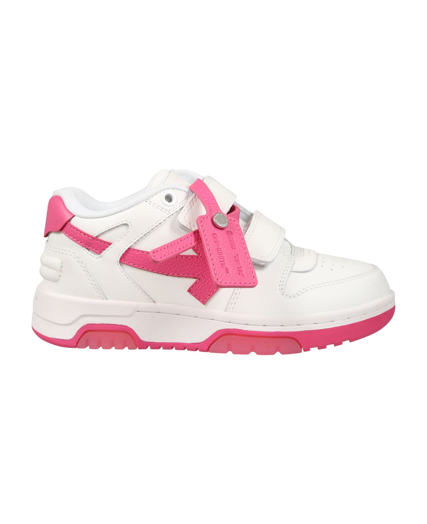 Fuchsia and white ''Out of Office'' sneakers, with rubber sole and velcro closure on the top. They are embellished with iconic arrow on the sides, iconic zip tye and logo on the back.