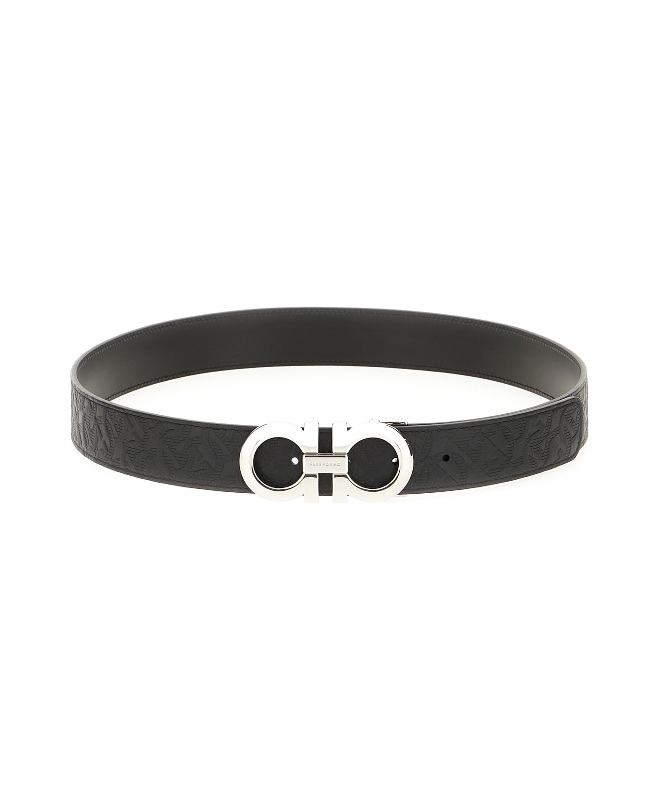 Reversible belt realized in Gancini embossed calf leather enriched by metal Gancini detail. -Adjustable snap-fit closure Composition: Exterior: 100% Calf Finishing: Silver metal
