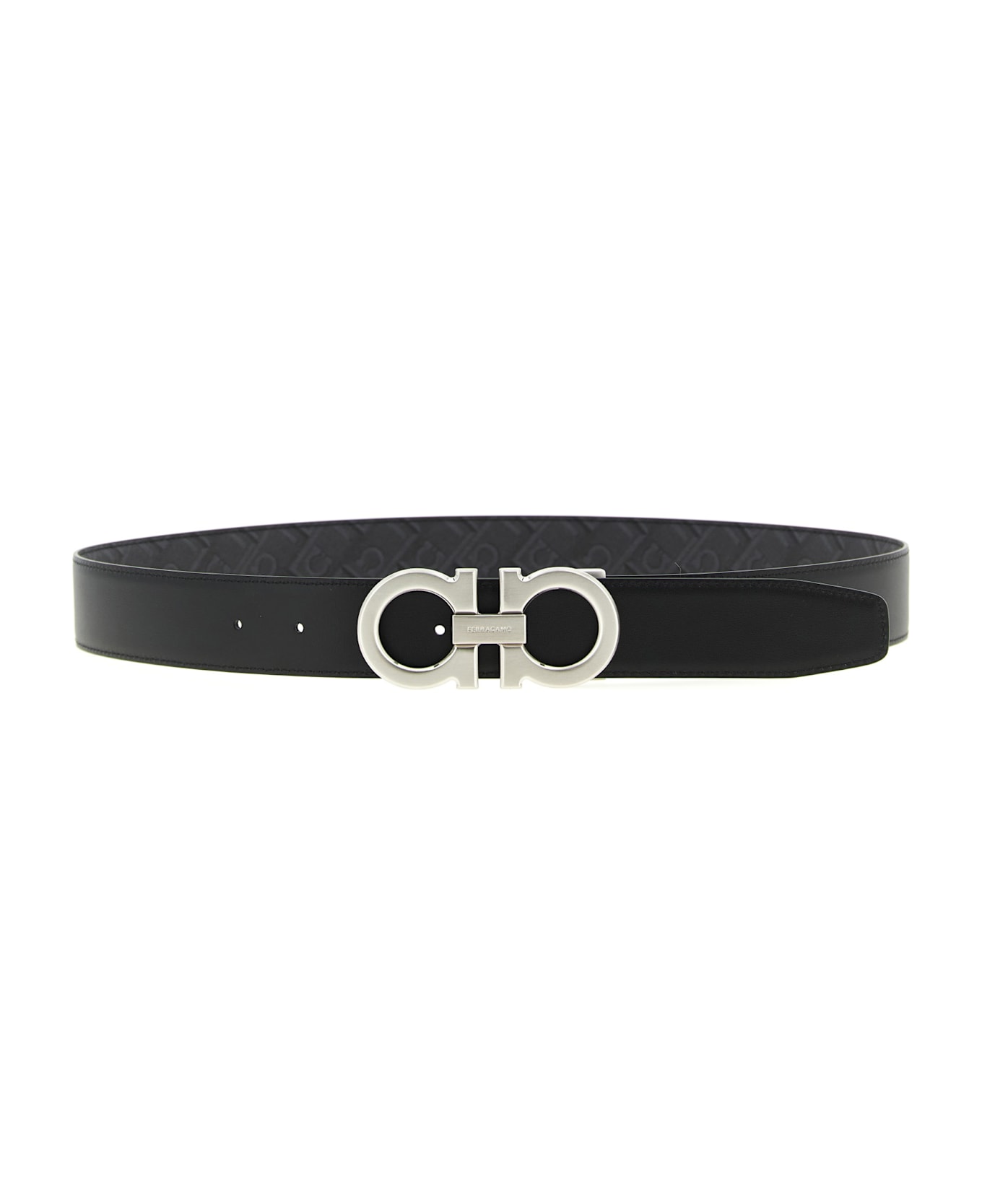 Black reversible leather belt with hook print and metal buckle. Composition: 64% polyurethane 20% polyester 16% cotton