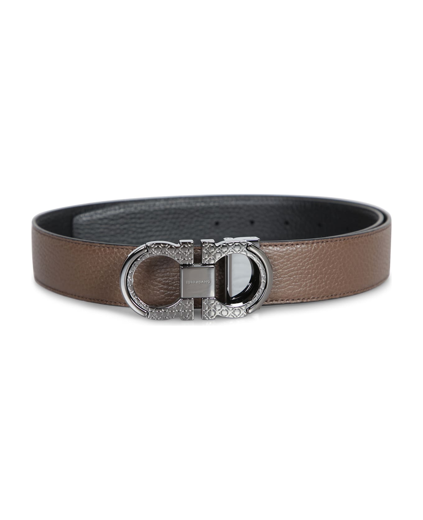 Ferragamo's reversible brown and black leather belt, embellished with the distinctive rotating Gancio buckle featuring refined engravings and an antique silver finish, epitomizes understated luxury and versatility. Composition: 100% Calf Leather