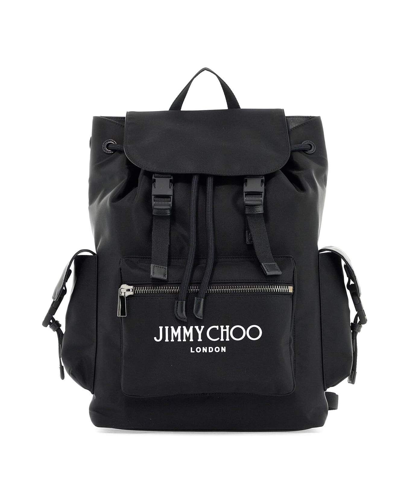 The Filmore backpack by Jimmy Choo is made of nylon with leather finishes and a rubber logo on the front pocket. It features a flap closure, buckles and drawstring, and a nylon interior with a zip pocket. The side pockets have flaps and buckles, while there is an additional zip pocket on the back. Padded shoulder straps, a top handle, and tonal metal accessories with a ruthenium finish complete the design.