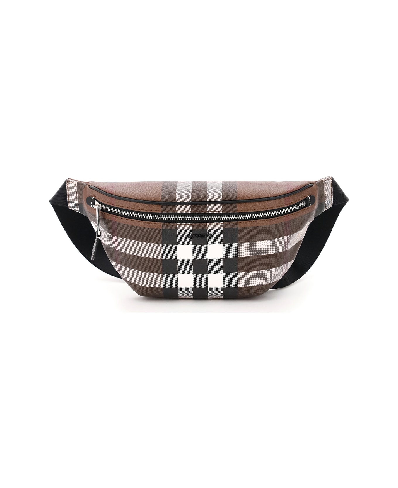 Burberry Cason belt bag made from tartan-patterned e-canvas with leather trims. Adjustable fabric belt with branded snap buckle, zip closure, back zip pocket and metal logo applied on the front. Interior lined in fabric with a flat leather pocket, palladium-finish metalware.