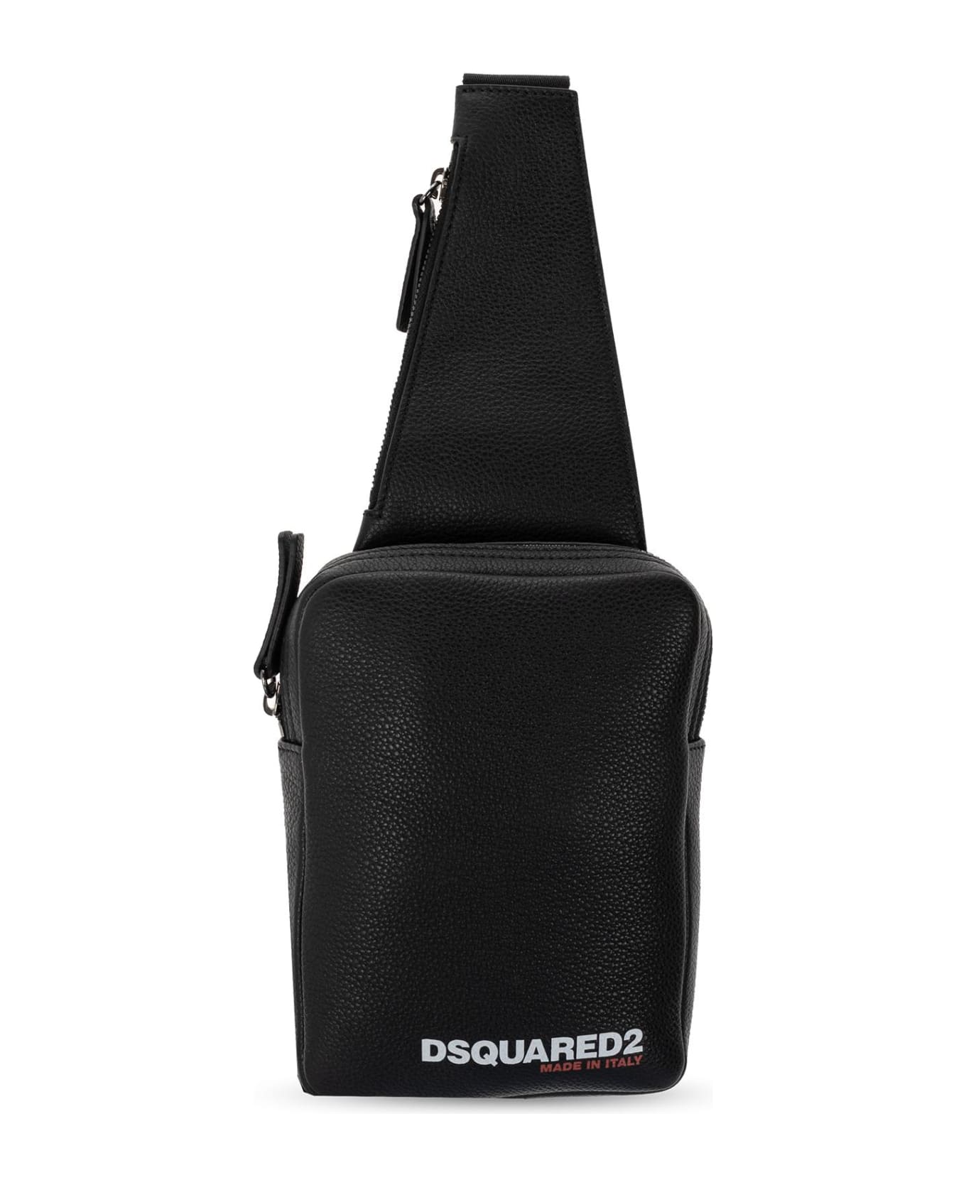 Black shoulder bag from Dsquared2. Crafted from grained faux leather, this design secures with a zip and showcases a printed white and red logo on the front. It is complete with an adjustable strap with a zip pocket and one internal compartment with a zip
